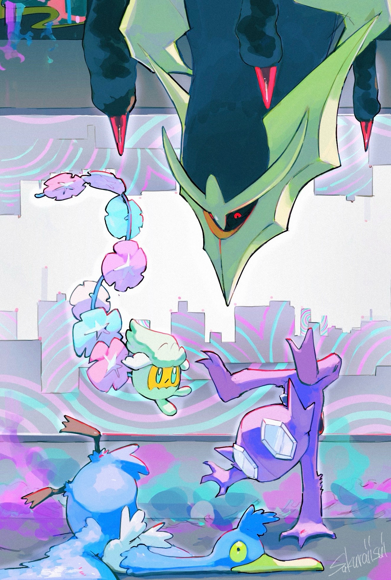 bird closed_mouth comfey commentary cramorant fallen_down gen_3_pokemon gen_4_pokemon gen_7_pokemon gen_8_pokemon giratina giratina_(origin) green_eyes handstand highres legendary_pokemon nintendo no_humans pokemon pokemon_(creature) pokemon_focus sableye sakuraiisui signature skyline