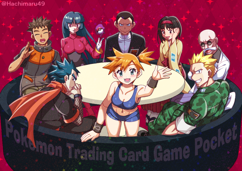 3girls 5boys :d arm_support asymmetrical_hair bald beard black_hair blaine_(pokemon) blonde_hair blue_eyes blue_hair blunt_bangs blush bodysuit breasts brock_(pokemon) brown_eyes brown_hair cleavage closed_mouth copyright_name couch crop_top dark_skin english_text erika_(pokemon) facial_hair fishnets formal_clothes gen_1_pokemon giovanni_(pokemon) glasses gloves green_eyes grin gym_leader hachimaru49 hairband holding jacket japanese_clothes kimono kneeling koga_(pokemon) lab_coat large_breasts long_hair long_sleeves looking_at_viewer medium_breasts midriff military misty_(pokemon) multiple_boys multiple_girls mustache navel nintendo open_mouth orange_hair pants pokemon pokemon_frlg pokemon_tcg pokemon_tcg_pocket ponytail purple_hair red_background red_eyes robe sabrina_(pokemon) scarf shirt short_hair shorts side_ponytail sitting smile sparkle spiked_hair spoon standing suit sunglasses lt._surge tank_top teeth telekinesis thighs twitter_username w waving white_gloves wristband