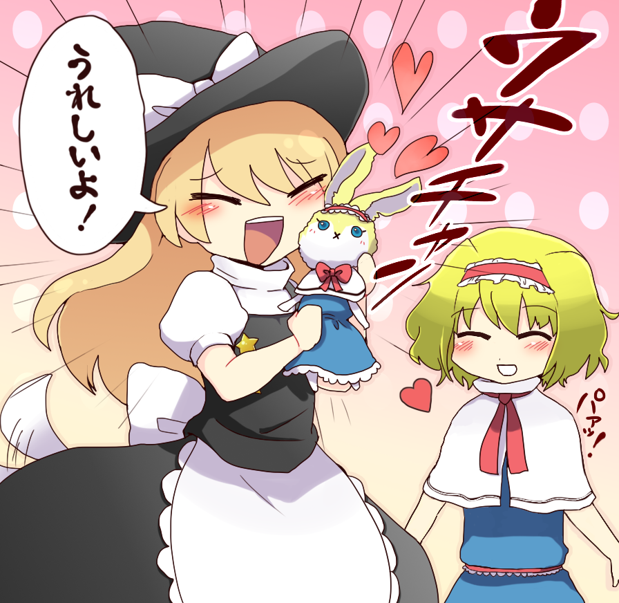2girls :d alice_margatroid apron black_hat black_skirt black_vest blonde_hair blue_dress blush capelet closed_eyes commentary_request cookie_(touhou) cowboy_shot doll dress frilled_apron frilled_hairband frills hairband hat heart holding holding_doll ichigo_(cookie) kirisame_marisa long_hair multiple_girls namatama_(7lemo_can) neckerchief open_mouth pink_background puffy_short_sleeves puffy_sleeves red_hairband red_neckerchief red_sash sash shirt short_hair short_sleeves skirt skirt_set smile star_(symbol) stuffed_animal stuffed_rabbit stuffed_toy suzu_(cookie) touhou translation_request turtleneck turtleneck_shirt vest waist_apron white_apron white_capelet white_shirt witch_hat x_mouth