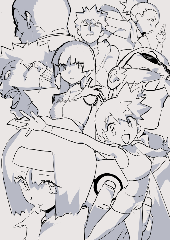 4boys 4girls :d asymmetrical_hair blaine_(pokemon) blunt_bangs breasts brock_(pokemon) closed_mouth crop_top erika_(pokemon) eyelashes facial_hair giovanni_(pokemon) gym_leader hairband headband ikafinity janine_(pokemon) long_hair looking_at_viewer misty_(pokemon) monochrome multiple_boys multiple_girls nintendo open_mouth outstretched_arms pokemon pokemon_frlg pokemon_hgss ponytail sabrina_(pokemon) scarf short_hair side_ponytail simple_background sleeveless smile spiked_hair spread_arms sunglasses lt._surge swimsuit tank_top white_background wristband