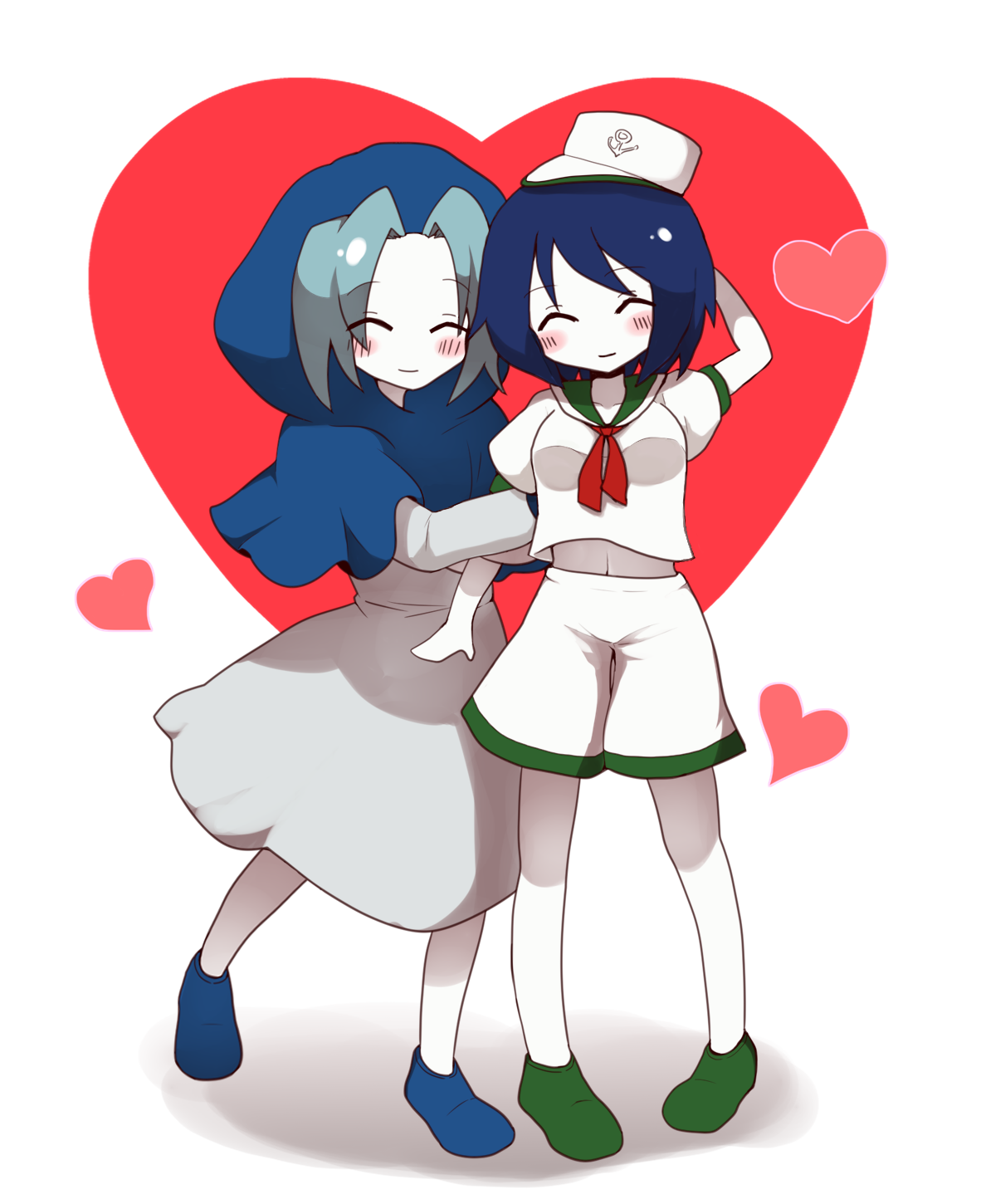 2girls anchor_symbol arm_hug blue_footwear blue_hood blush closed_eyes closed_mouth colored_skin commentary_request cookie_(touhou) dress flour_(cookie) full_body green_footwear grey_dress hat heart heart_background highres hood hood_up kumoi_ichirin midriff_peek milk_(cookie) multiple_girls murasa_minamitsu namatama_(7lemo_can) neckerchief puffy_short_sleeves puffy_sleeves red_neckerchief sailor_hat shirt shoes short_hair short_sleeves shorts smile standing touhou white_hat white_shirt white_shorts white_skin
