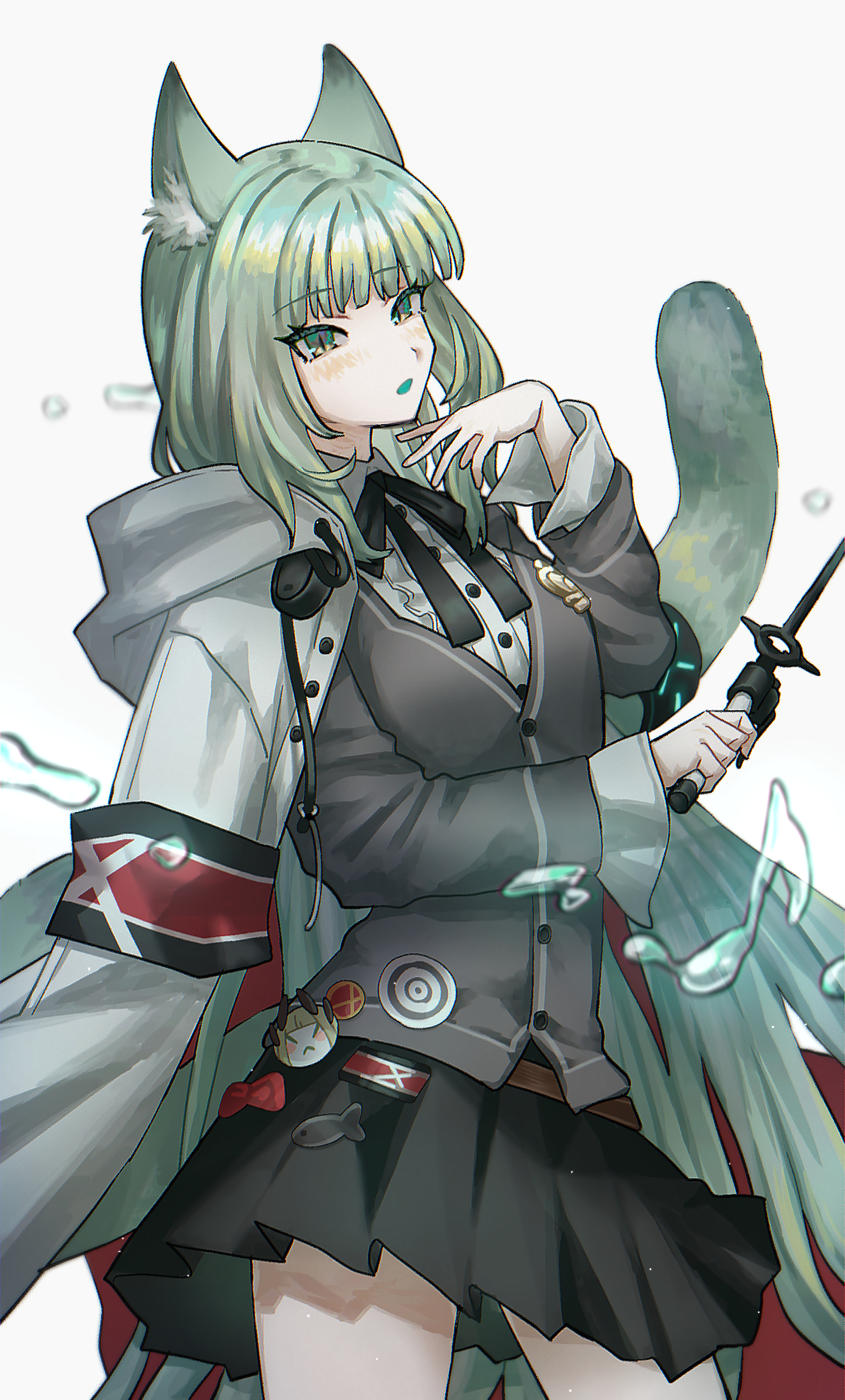 1girl absurdres animal_ear_fluff animal_ears arknights auy0_(nemuru) black_skirt buttons cardigan coat coat_on_shoulders colored_mouth commentary cowboy_shot eighth_note green_eyes green_hair green_tail grey_background grey_cardigan grey_coat hand_up harmonie_(arknights) highres holding hood hood_down hooded_coat hydrokinesis infection_monitor_(arknights) long_hair long_sleeves musical_note open_mouth red_coat simple_background skirt solo standing tail tail_raised two-sided_coat two-sided_fabric very_long_hair water