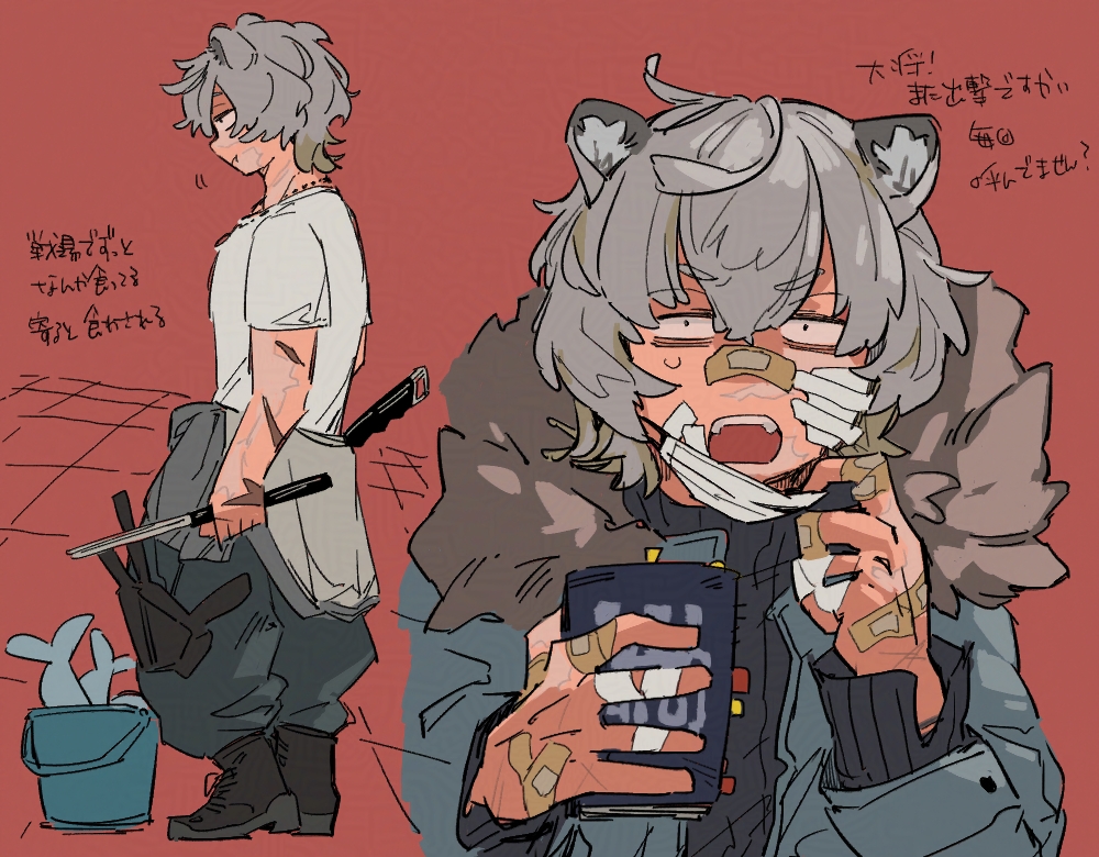 1boy arknights bandaid bandaid_on_face bandaid_on_finger bandaid_on_hand bandaid_on_nose black_sweater book grey_hair holding holding_book holding_knife jaye_(arknights) jaye_(elite_ii)_(arknights) knife looking_at_viewer mask_pull multiple_views open_mouth pants red_background scar sijo_nm simple_background sweat sweater translation_request