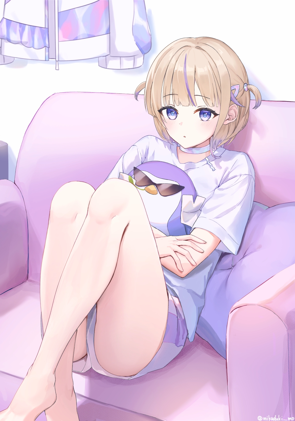 1girl :o bare_legs barefoot blonde_hair choker couch cushion feet_out_of_frame highres holding holding_stuffed_toy hololive hololive_dev_is indoors jacket knees_up looking_at_viewer mizuki_(s0511) multicolored_hair parted_lips purple_eyes shirt short_hair short_shorts shorts sitting solo streaked_hair stuffed_animal stuffed_penguin stuffed_toy thighs todoroki_hajime two_side_up unworn_jacket virtual_youtuber white_choker white_shirt