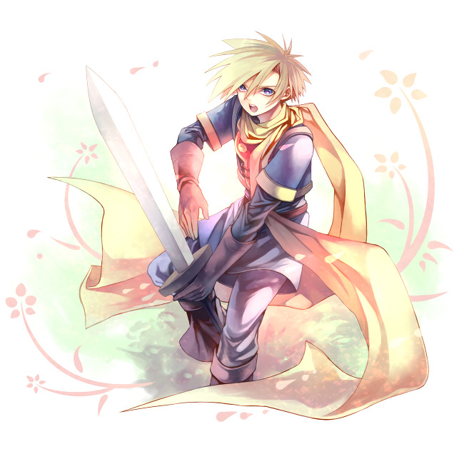 1boy belt blonde_hair blue_eyes blue_pants blue_tunic brown_gloves gloves golden_sun gradient_clothes holding holding_sword holding_weapon isaac_(golden_sun) medium_hair oas pants scarf short_sleeves solo sword tunic weapon white_background yellow_scarf