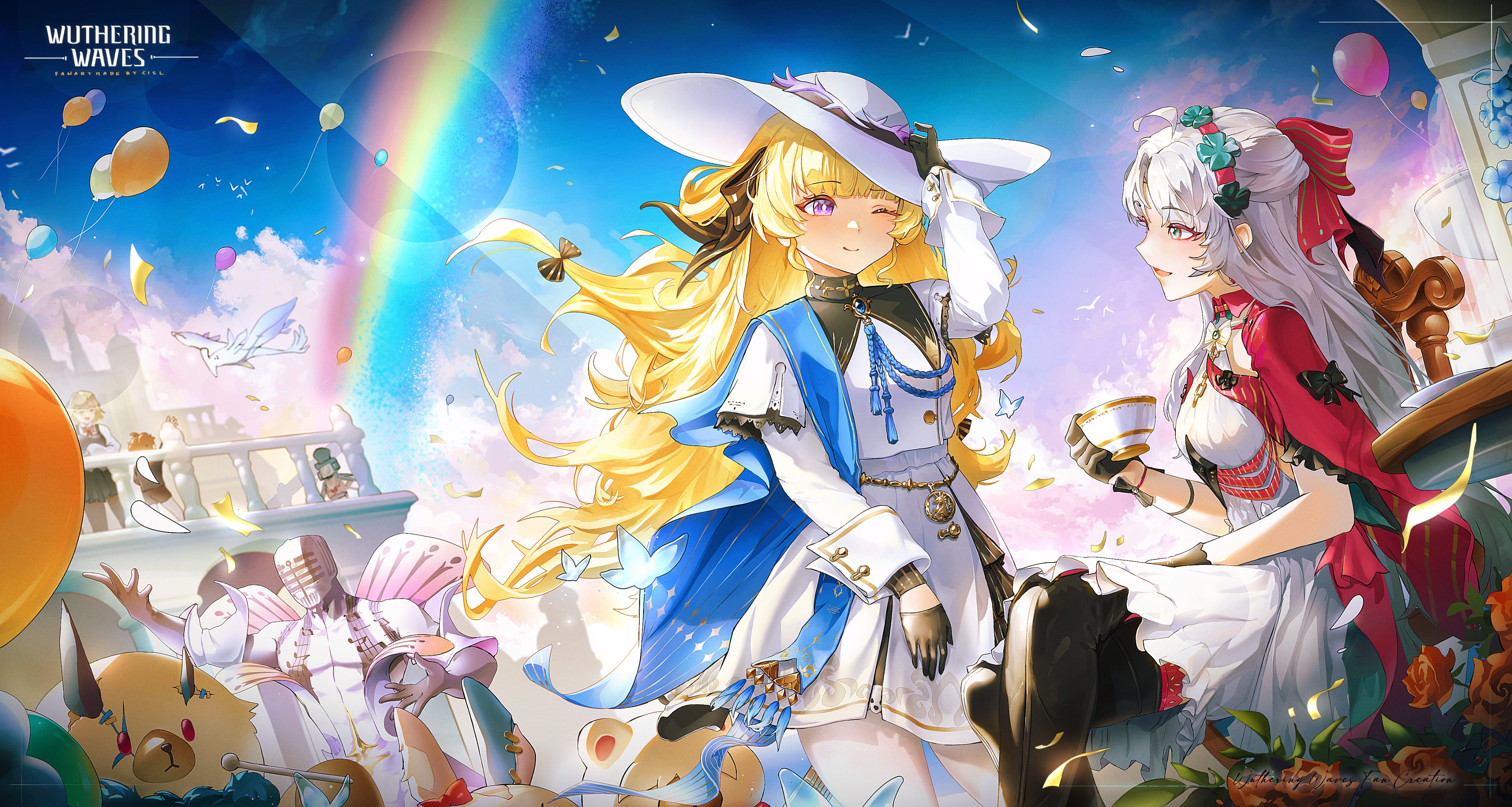 absurdres aqua_eyes balloon black_bow black_collar black_gloves blonde_hair blue_sky bow breasts carlotta_(wuthering_waves) cisl closed_mouth collar confetti crossed_legs cup day dress gloves hair_bow hair_spread_out hairband hand_on_own_hat hat highres holding holding_cup jacket logo long_hair looking_at_another one_eye_closed open_mouth outdoors pantyhose phoebe_(wuthering_waves) pink_bow pink_hairband pink_jacket purple_eyes purple_pupils short_dress sitting sky small_breasts smile striped_bow teacup very_long_hair white_dress white_hair white_hat white_pantyhose wuthering_waves