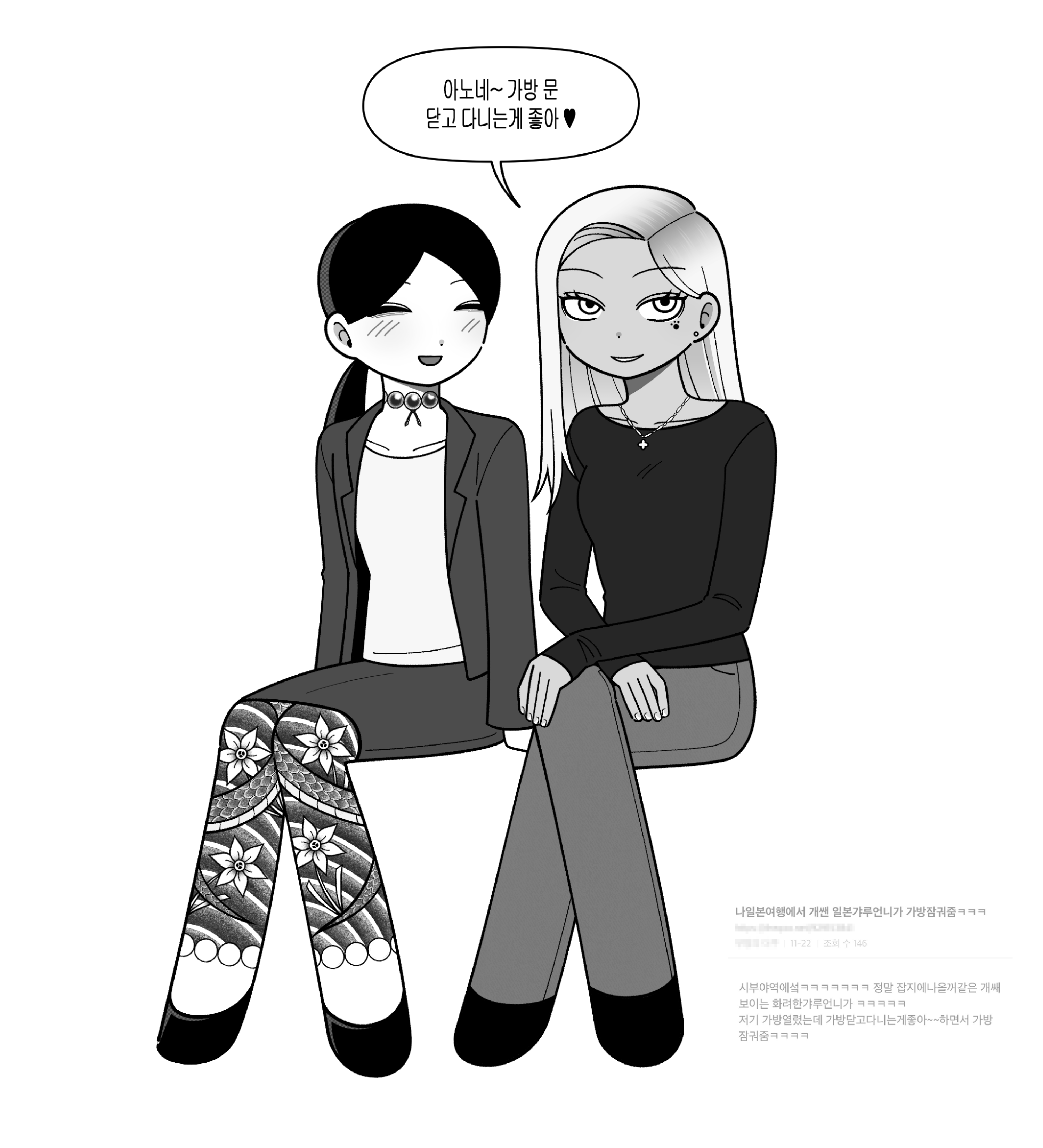 2girls 6rdv absurdres bad_id bad_twitter_id bead_necklace beads blush claire_(jimoto_saikou) commentary_request crossed_legs dark-skinned_female dark_skin denim facing_another formal_clothes full_body greyscale hands_on_lap highres invisible_chair irezumi jacket jeans jewelry jimoto_saikou korean_commentary korean_text leg_tattoo long_hair long_sleeves looking_at_viewer low_ponytail monochrome multiple_girls necklace open_clothes open_jacket open_mouth pants parted_bangs pencil_skirt pendant ponytail sanpaku shirt shizuka_(jimoto_saikou) shoes side-by-side simple_background sitting skirt skirt_suit smile speech_bubble suit suit_jacket tattoo translation_request