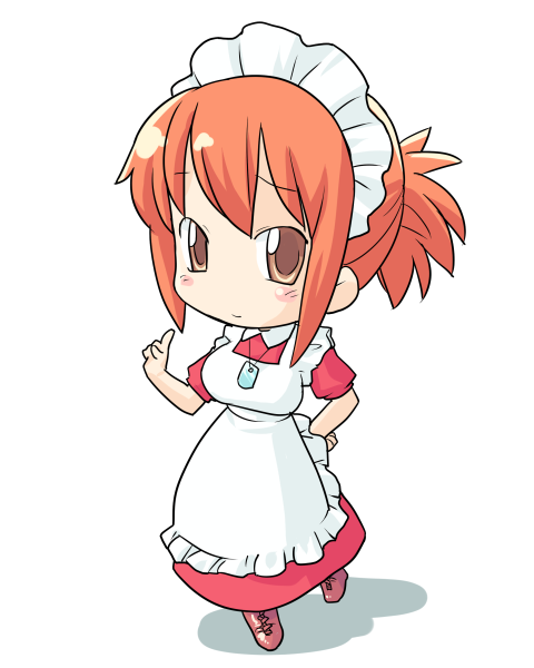 1girl apron artist_request breasts brown_eyes check_artist closed_mouth dress full_body furrowed_brow futaba_channel hand_on_own_hip hand_up hinemosu_notari index_finger_raised kudoi large_breasts maid maid_apron maid_headdress nijiura_maids no_nose orange_hair ponytail red_dress red_footwear shadow short_hair short_ponytail short_sleeves simple_background smile solo third-party_source white_apron white_background