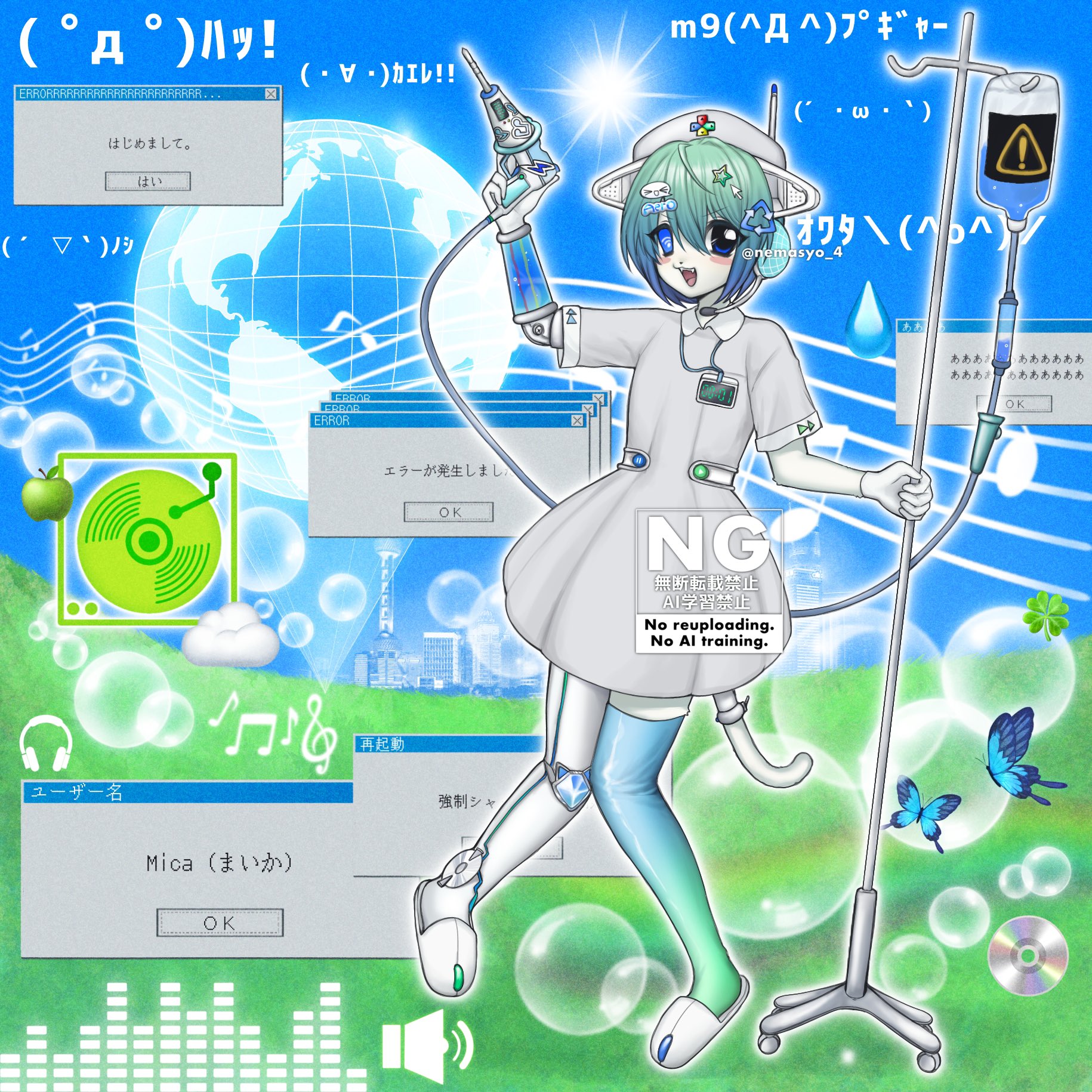 1boy 2000s_(style) animal_ears apple bubble bug building butterfly cat_boy cat_ears cat_tail cd commentary_request crossdressing crossdressing_(mtf) dress emoticon food fruit frutiger_aero grass highres hologram humanoid_robot insect intravenous_drip kaomoji looking_at_viewer male_focus microsoft_windows musical_note nemasyo_4 open_mouth original outdoors robot robot_ears sky solo tail translation_request trap watermark white_dress window_(computing) windows_2000 windows_classic
