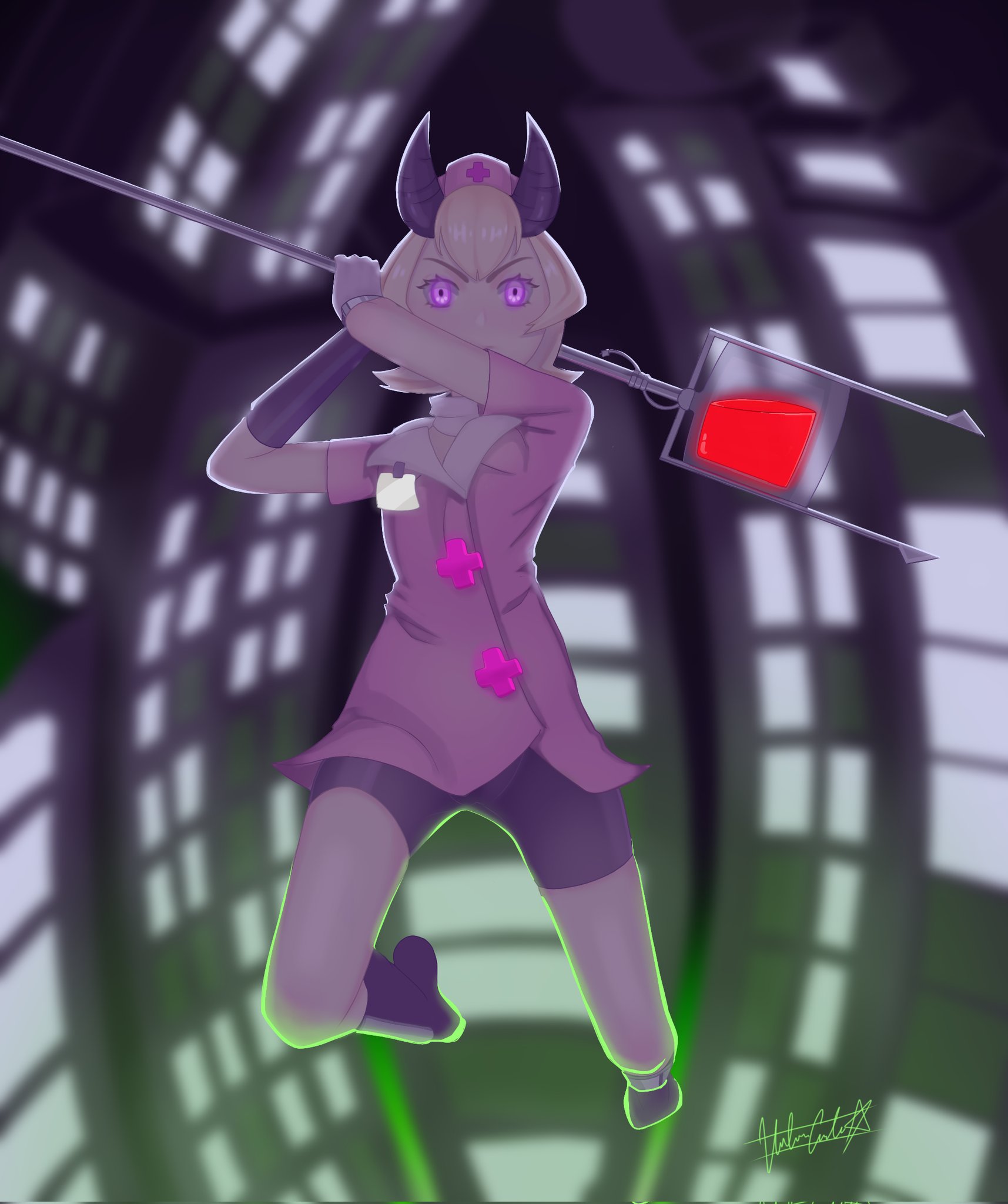 attack cityscape gloves hat highres iv_stand latex latex_gloves nurse nurse_cap patty_(skullgirls) skullgirls tagme uwmangito weapon