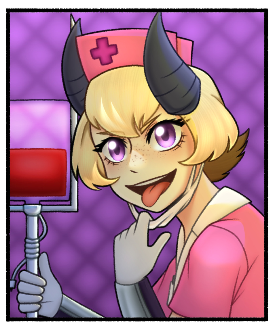 freckles gloves hat iv_stand latex latex_gloves mask mouth_mask nurse nurse_cap patty_(skullgirls) skullgirls surgical_mask tabunierka tongue tongue_out