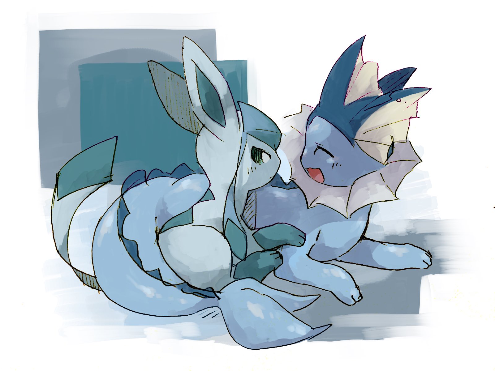 :d animal_focus animal_hands blue_eyes blue_fur closed_eyes fins fish_tail full_body gen_1_pokemon gen_4_pokemon glaceon head_fins highres looking_at_another lying nintendo no_humans open_mouth pokemon pokemon_(creature) simple_background smile tail vaporeon watanuki_(561yashi) white_background