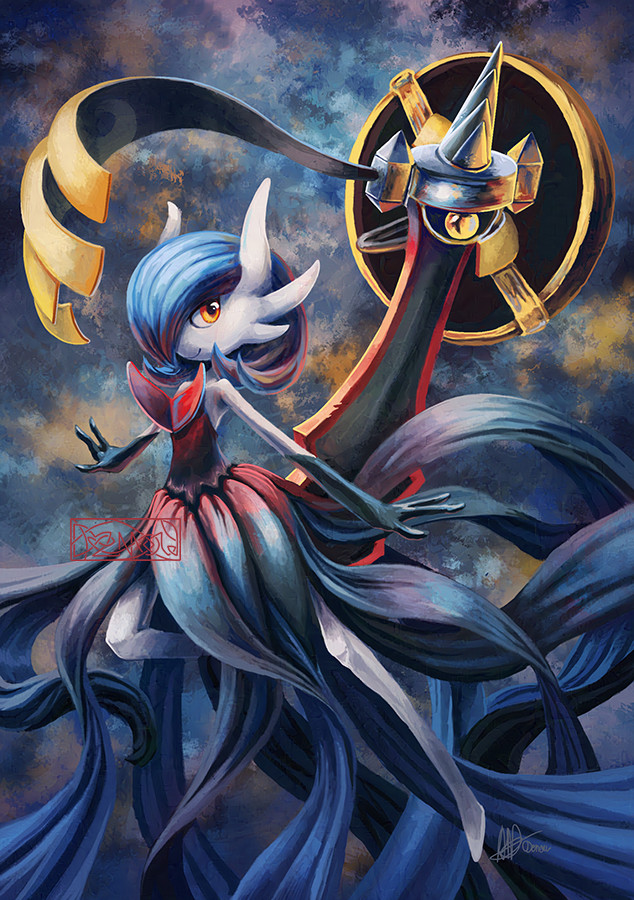 aegislash alternate_color auddenou black_dress blue_hair bob_cut dress elbow_gloves gardevoir gen_3_pokemon gen_6_pokemon gloves holding holding_shield mega_gardevoir mega_pokemon nintendo one-eyed orange_eyes pokemon pokemon_(creature) shield shiny_pokemon signature smile strapless strapless_dress sword weapon white_gloves yellow_eyes