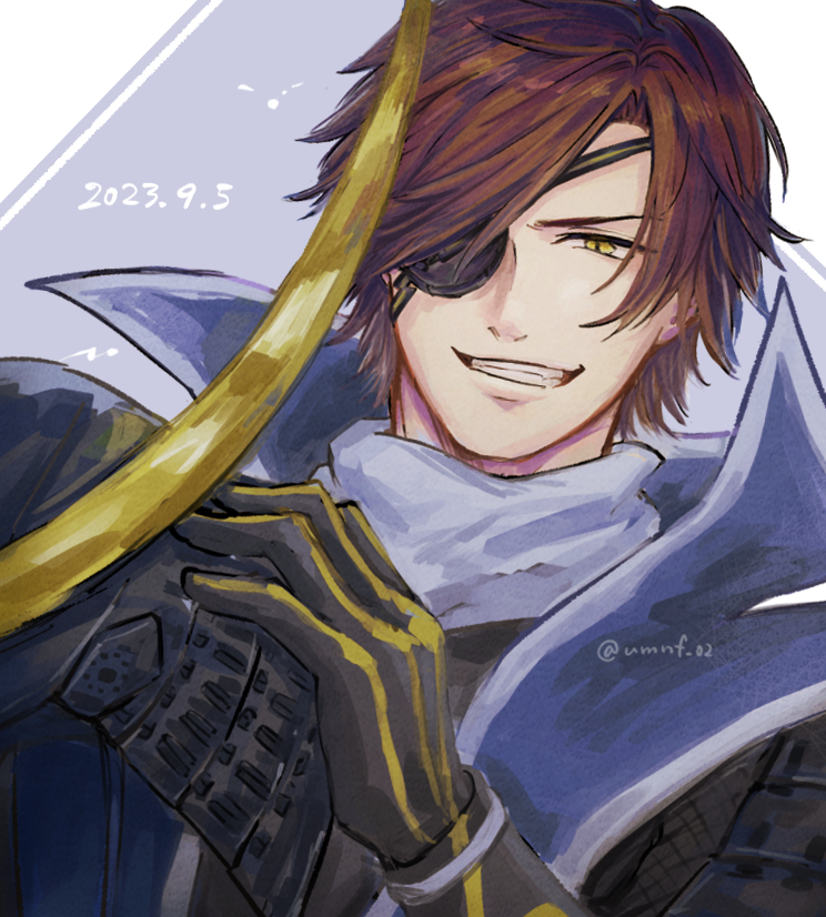 1boy armor black_gloves brown_hair date_masamune_(sengoku_basara) dated eyepatch gloves grin helmet holding holding_unworn_helmet japanese_armor kabuto_(helmet) male_focus portrait sengoku_basara short_hair smile solo twitter_username umi_no_fuji unworn_headwear unworn_helmet yellow_eyes