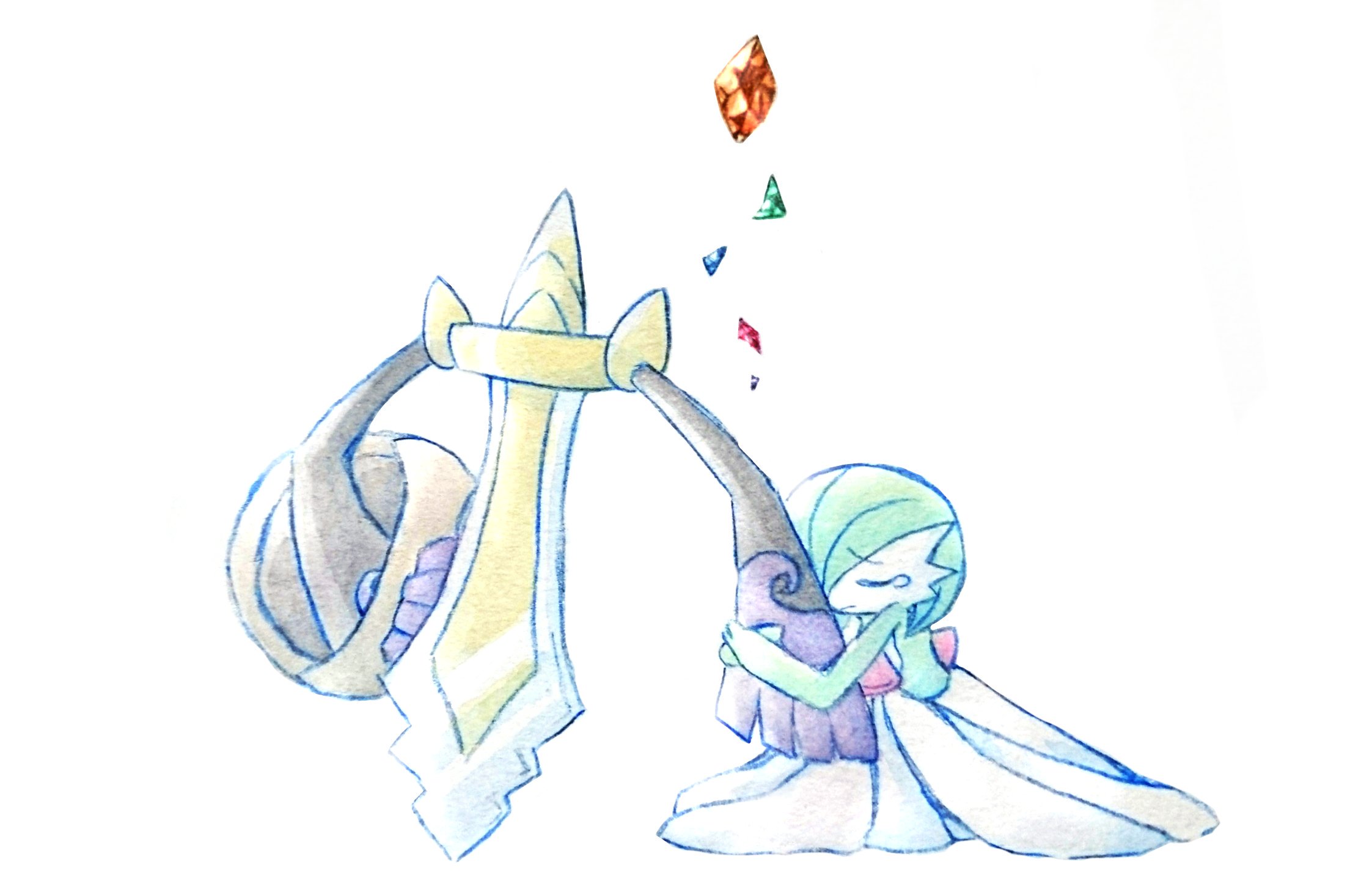 aegislash bob_cut closed_eyes colored_skin dress floating gardevoir gem gen_3_pokemon gen_6_pokemon green_hair green_skin hair_over_one_eye highres holding holding_shield multicolored_skin nintendo poke_gm50 pokemon pokemon_(creature) shield simple_background single_tear sword two-tone_skin weapon white_background white_dress white_skin