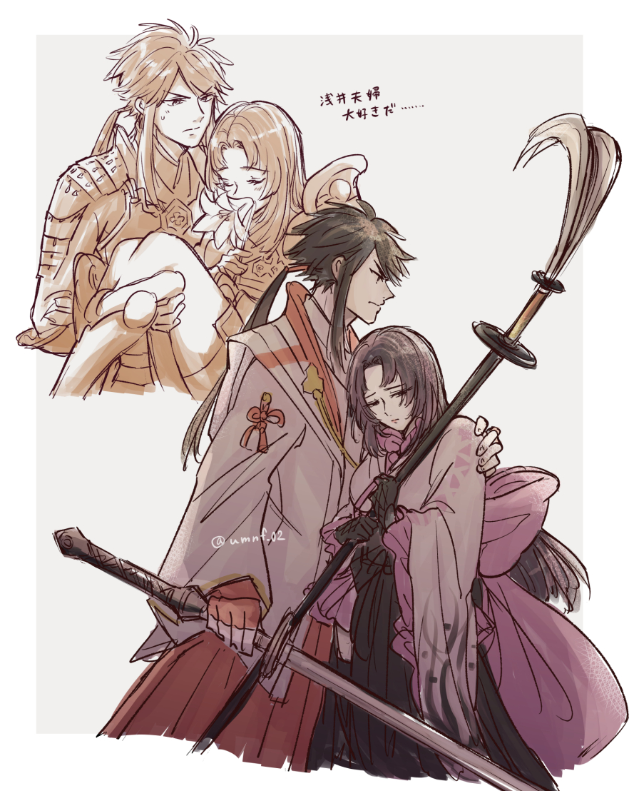 1boy 1girl azai_nagamasa_(sengoku_basara) black_gloves black_hair fingerless_gloves frown gloves hand_on_another's_shoulder holding holding_polearm holding_sword holding_weapon husband_and_wife long_hair low_ponytail official_alternate_costume oichi_(sengoku_basara) polearm ponytail red_gloves sengoku_basara sidelocks sketch sword umi_no_fuji weapon
