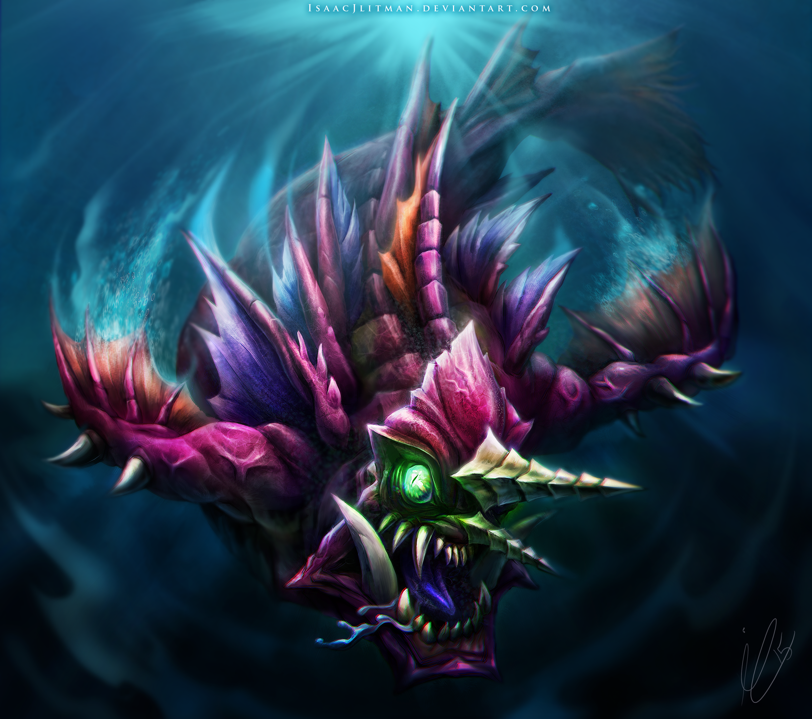 animal_focus commentary english_commentary fish full_body green_eyes gyorg highres horns isaacjlitman monster nintendo no_humans open_mouth saliva sharp_teeth signature slit_pupils solo swimming teeth the_legend_of_zelda the_legend_of_zelda:_majora's_mask
