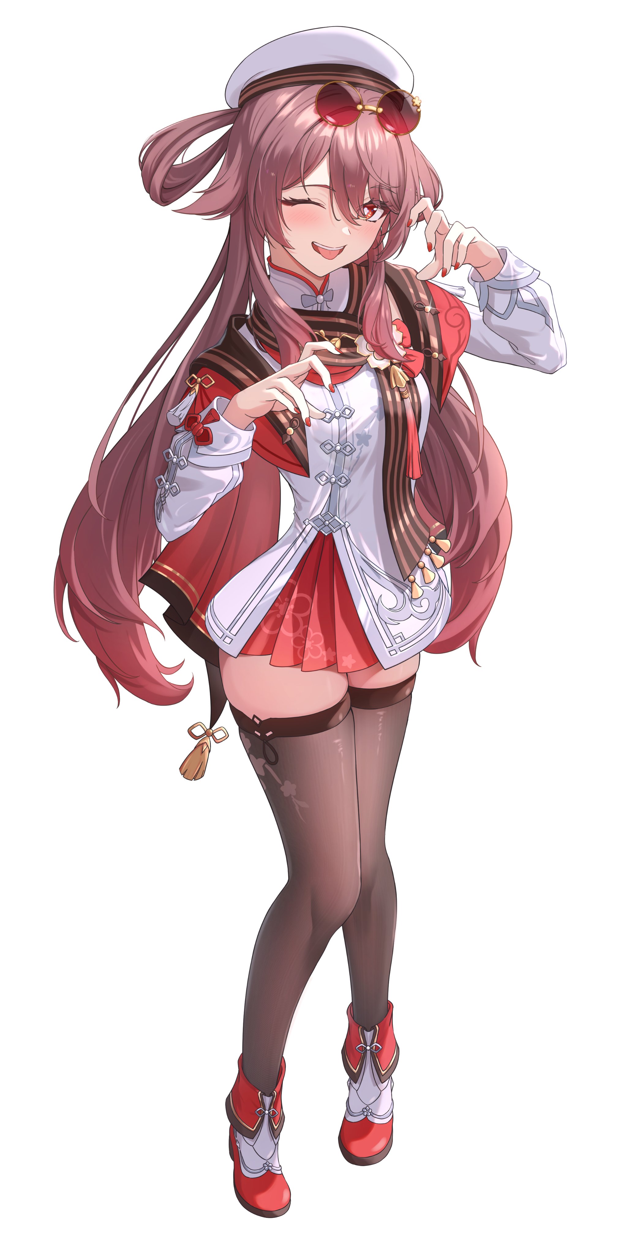 1girl absurdres black_thighhighs brown_hair chinese_clothes commentary_request eyewear_on_head fingerless_gloves flower-shaped_pupils full_body genshin_impact gloves gradient_hair hair_between_eyes hands_up hat highres hu_tao_(cherries_snow-laden)_(genshin_impact) hu_tao_(genshin_impact) long_hair long_sleeves looking_at_viewer multicolored_hair nail_polish official_alternate_costume one_eye_closed open_mouth red-tinted_eyewear red_eyes red_footwear red_hair red_nails round_eyewear simple_background solo symbol-shaped_pupils thighhighs tinted_eyewear tongue tongue_out twintails very_long_hair vic_1223 white_background white_hat yellow-framed_eyewear