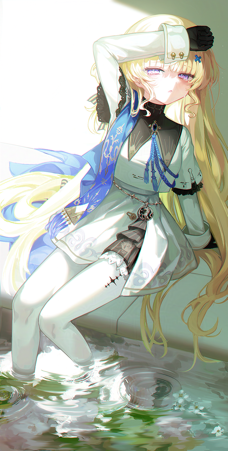 1girl arm_up black_collar black_gloves blonde_hair breasts collar commentary dress gloves hair_ornament highres karou_(lhscck302) long_hair long_sleeves looking_at_viewer missing_headwear pantyhose phoebe_(wuthering_waves) purple_eyes sitting small_breasts soaking_feet solo very_long_hair white_dress white_pantyhose wuthering_waves x_hair_ornament