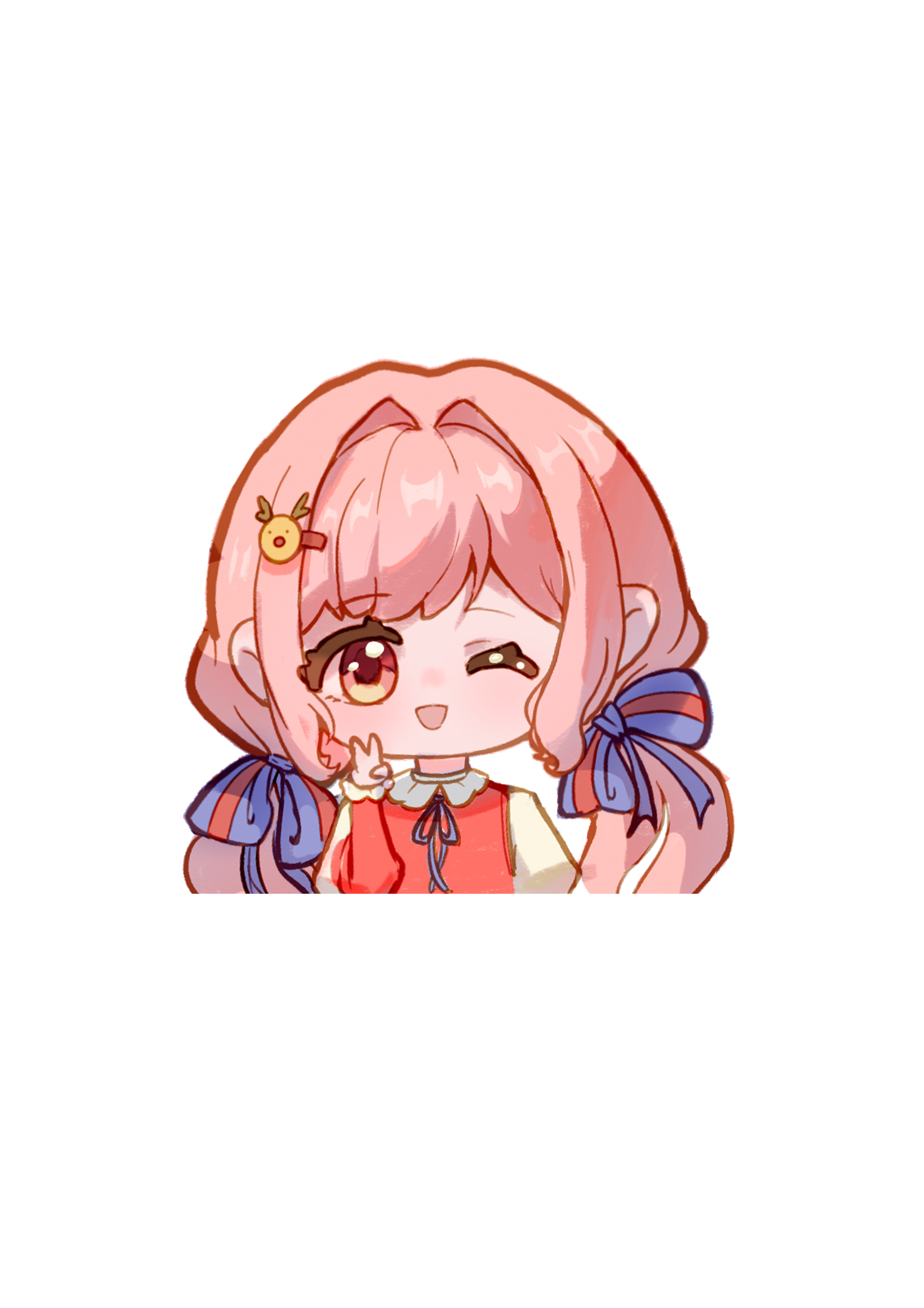 1girl absurdres blue_ribbon bow brown_eyes chibi chinese_commentary christmas collared_shirt commentary_request cropped_torso dress eyelashes frilled_shirt_collar frilled_sleeves frills hair_bow hair_intakes hair_ornament hairclip happy highres juliet_sleeves light_blush long_hair long_sleeves low_twintails meiyou_mingzi neck_ribbon nikki_(nikki) nikki_(series) one_eye_closed open_mouth outline pinafore_dress pink_hair puffy_sleeves purple_bow red_dress red_sleeves reindeer reindeer_hair_ornament ribbon shirt single_stripe sleeveless sleeveless_dress smile solo striped_bow tareme transparent_background twintails two-tone_sleeves v very_long_hair wavy_hair white_outline white_shirt