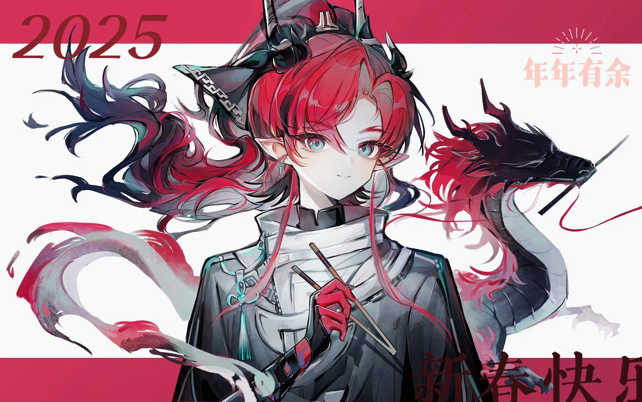 1boy 2025 aqua_eyes arknights black_hair black_jacket chopsticks closed_mouth commentary_request dragon eastern_dragon floating_hair gradient_hair hair_intakes highres holding holding_chopsticks horns jacket long_hair looking_at_viewer male_focus multicolored_hair pointy_ears red_hair smile solo tassel tency_(1733djy) upper_body yu_(arknights)