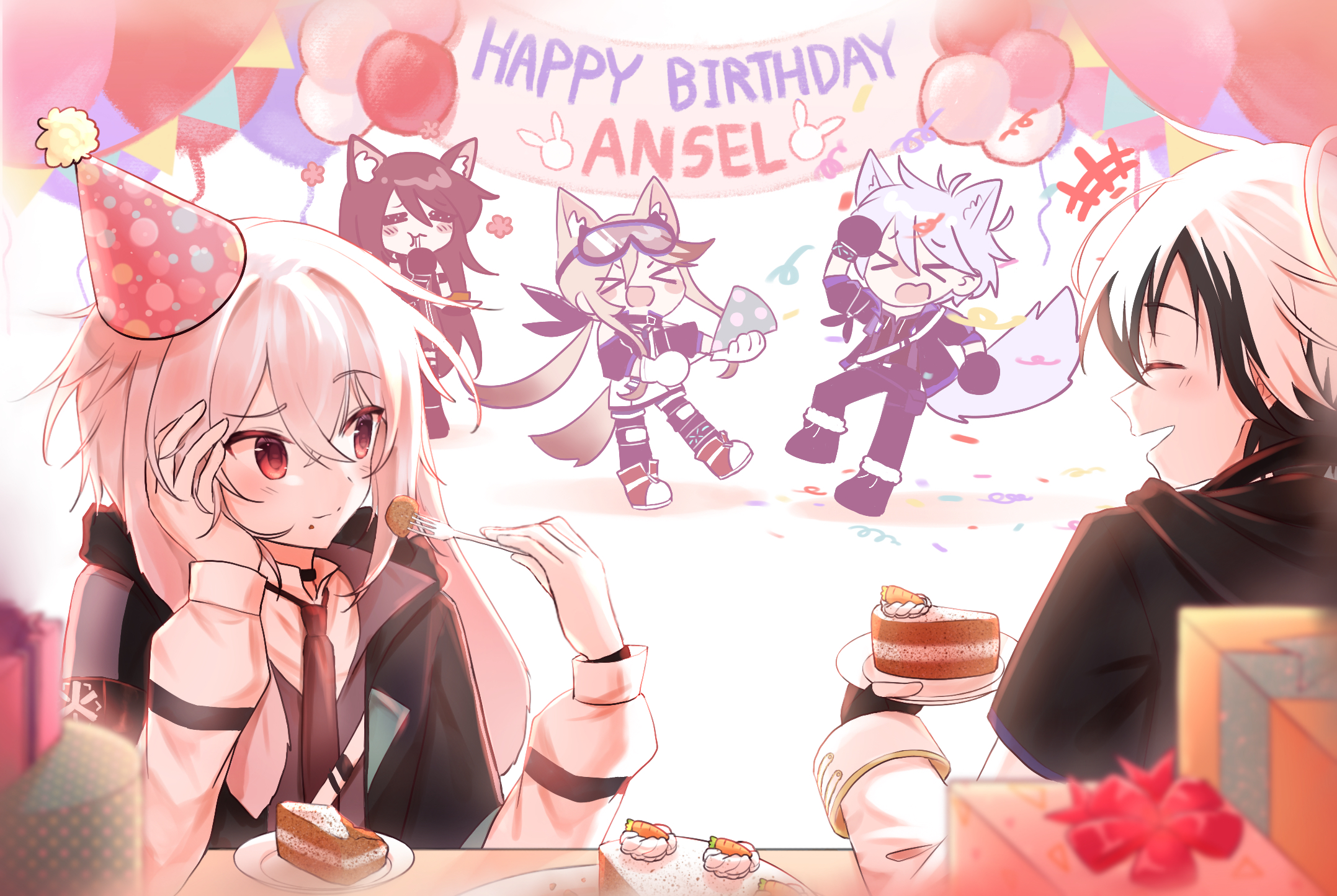 >_< 2girls 3boys :d =_= adnachiel_(arknights) animal_ears ansel_(arknights) arknights brown_hair cardigan_(arknights) cat_ears cat_girl closed_eyes closed_mouth commentary dog_ears dog_girl dog_tail english_commentary fork fox_boy fox_ears fox_tail goggles goggles_on_head happy_birthday hat highres holding holding_fork long_sleeves melantha_(arknights) multiple_boys multiple_girls open_mouth party_hat pink_hair puffy_long_sleeves puffy_sleeves rabbit_boy rabbit_ears red_eyes rinzy short_hair smile steward_(arknights) tail white_hair