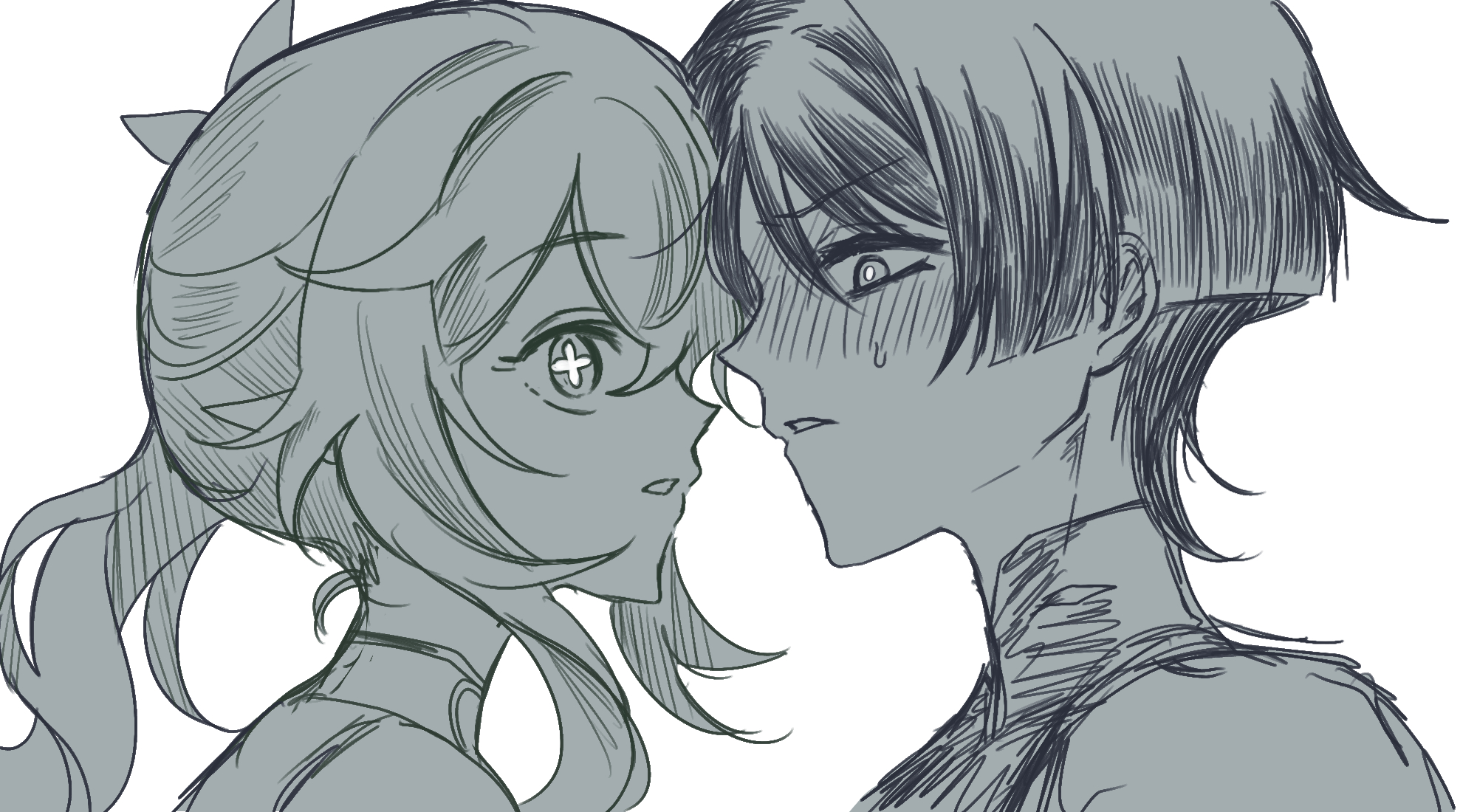 1boy 1girl bare_shoulders blunt_ends blush bodysuit cross-shaped_pupils from_side genshin_impact hetero highres ht_reborn long_hair looking_at_viewer mandarin_collar monochrome nahida_(genshin_impact) open_mouth pointy_ears profile scaramouche_(genshin_impact) side_ponytail sidelocks sideways_mouth sketch sweatdrop symbol-shaped_pupils wanderer_(genshin_impact)