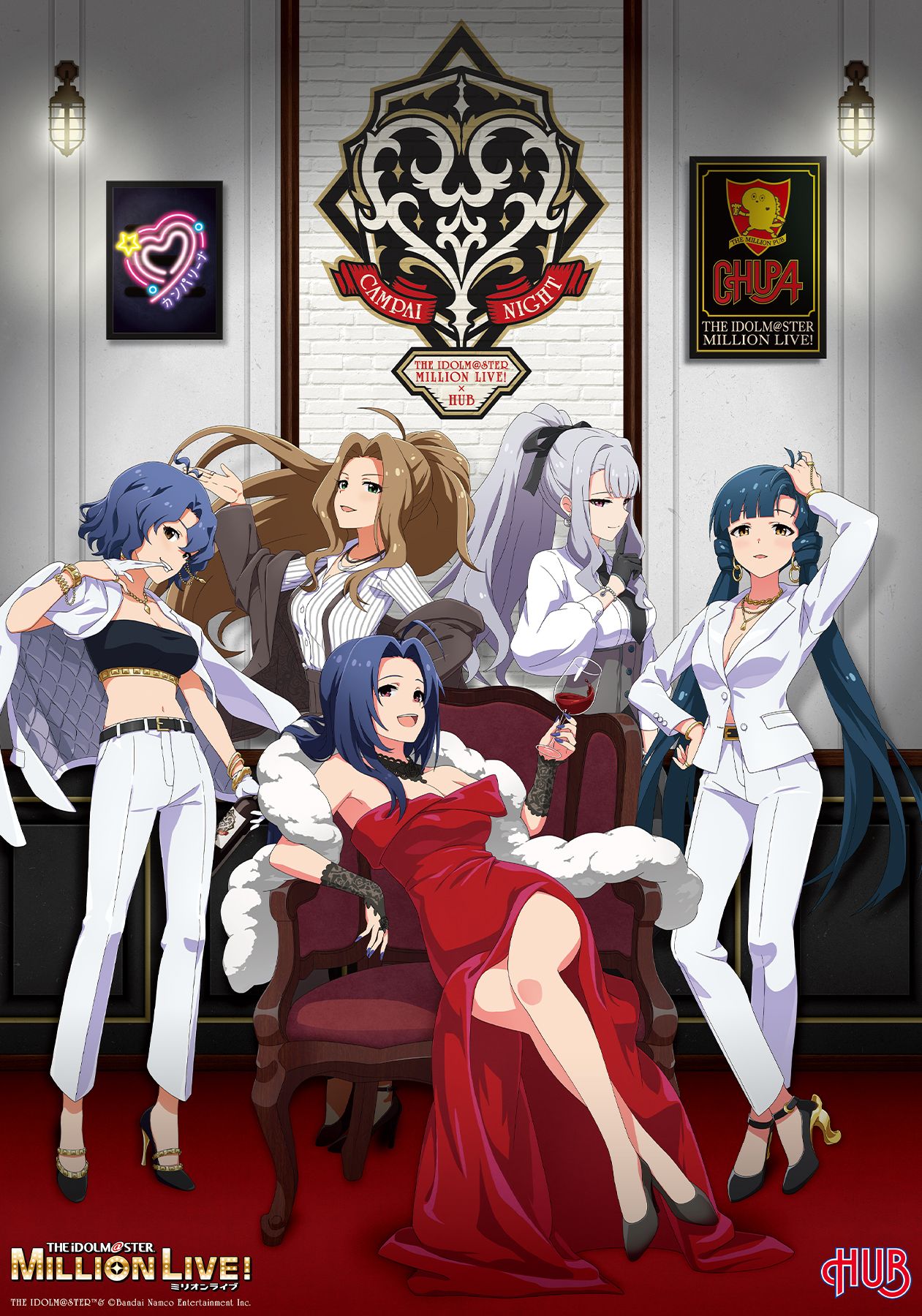 5girls belt blue_hair breasts brown_hair chair chupacabra_(idolmaster) cleavage copyright_name cup dress drinking_glass earrings english_text gloves green_eyes grey_hair high_heels highres holding hub_-british_pub- idolmaster idolmaster_million_live! idolmaster_million_live!_theater_days jacket jacket_on_shoulders japanese_text jewelry kitakami_reika low_twintails miura_azusa multiple_girls nail_polish navel nikaido_chizuru off_shoulder official_art pants ponytail promotional_art purple_eyes red_dress red_eyes shijou_takane toyokawa_fuka twintails wine_glass yellow_eyes