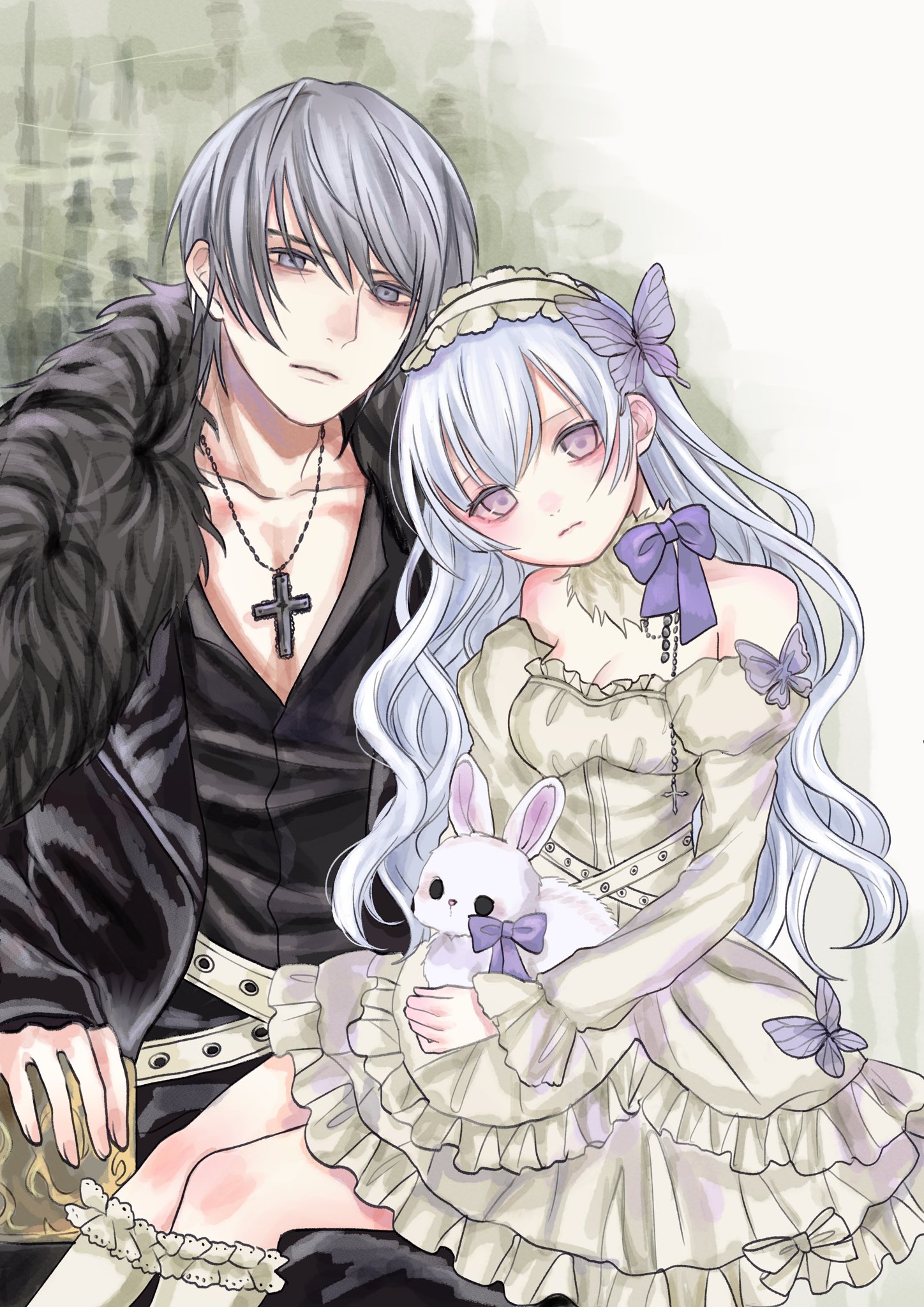 1boy 1girl bare_shoulders belt black_shirt butterfly_hair_ornament cross cross_necklace dress frilled_skirt frills gokuraku_fish hair_ornament hairband highres jewelry lolita_fashion lolita_hairband long_hair necklace original purple_eyes shirt sitting skirt stuffed_animal stuffed_rabbit stuffed_toy white_hair