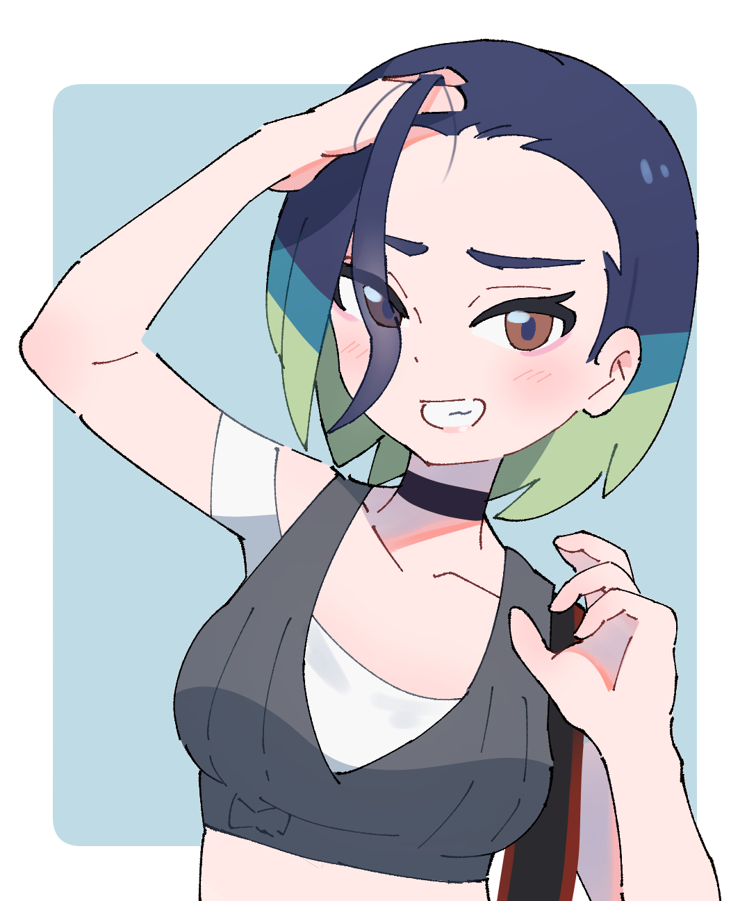 1girl arm_up bare_shoulders black_choker blue_hair bob_cut breasts brown_eyes choker collarbone commentary_request crop_top gradient_hair grey_shirt hand_up highres loose_hair_strand medium_breasts midriff multicolored_hair nagumo_uka nintendo partial_commentary perrin_(pokemon) pokemon pokemon_sv ribbed_shirt shirt short_hair sleeveless sleeveless_shirt solo undershirt upper_body v-neck