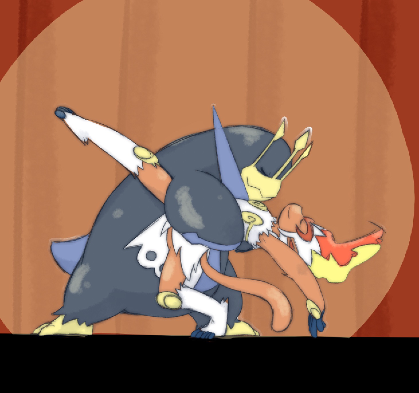 beak black_fur brown_fur dancing empoleon fire gen_4_pokemon highres infernape monkey_tail nintendo no_humans pokemon pokemon_(creature) pokemon_diamond/pearl/platinum smile spotlight tail tatu_wani webbed_feet white_fur