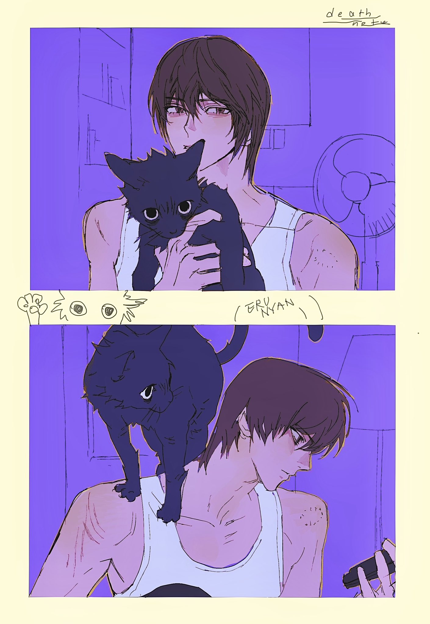 2boys animal animal_on_shoulder animalization bare_shoulders black_cat black_eyes black_fur border brown_eyes brown_hair cat cat_on_shoulder death_note hair_between_eyes highres holding holding_animal holding_cat kinbakuoujii l_(death_note) male_focus multiple_boys parted_lips purple_background scratches short_hair tank_top upper_body white_tank_top yagami_light yellow_border