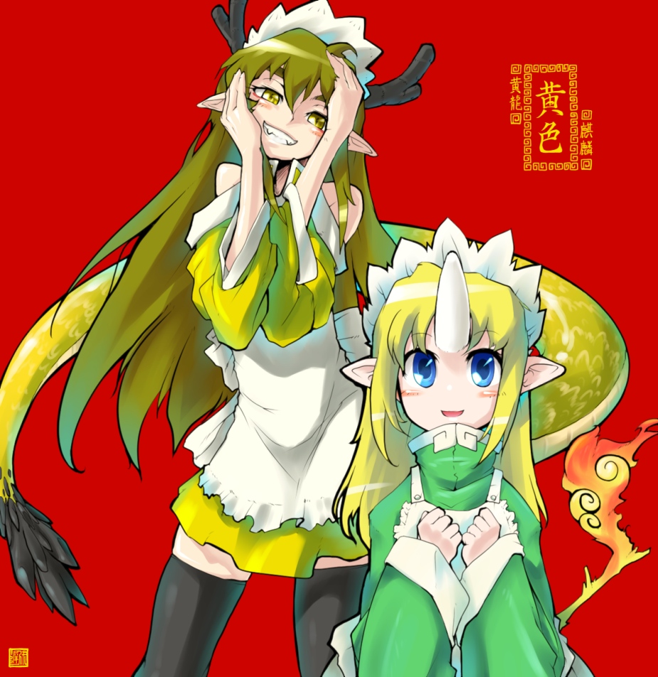2girls :d antlers apron back_bow bare_shoulders black_horns black_thighhighs blonde_hair blue_eyes bow clenched_hand commentary_request dragon_girl dragon_tail dress fangs futaba_channel green_dress green_tail grin hair_between_eyes hand_on_own_face hand_on_own_head hands_up head_tilt horns kirin_(nijiura_maids) kouryuu_(nijiura_maids) legs_apart maid maid_apron maid_headdress multiple_girls nijiura_maids open_mouth oso_(toolate) pointy_ears red_background short_dress simple_background single_horn smile standing tail teeth thick_eyebrows thighhighs very_long_tail white_apron white_bow white_horns yellow_dress yellow_eyes yellow_tail zettai_ryouiki