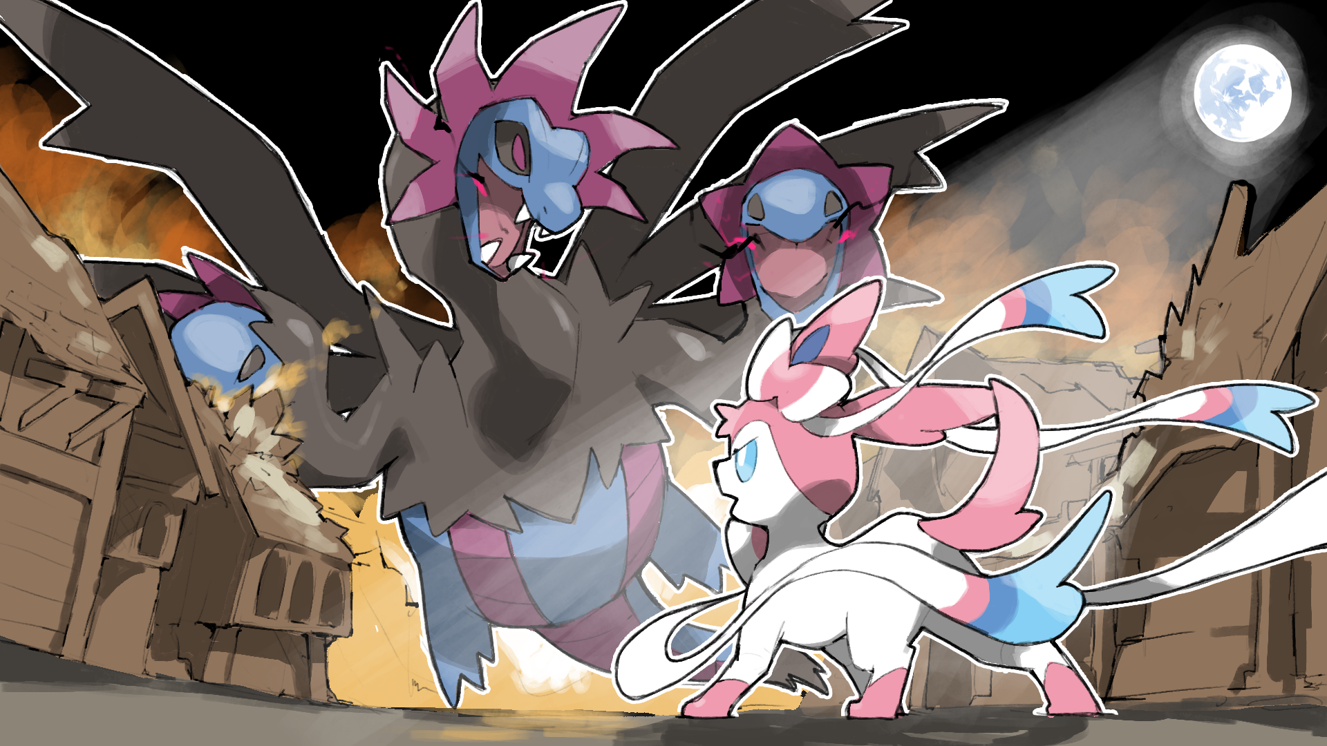 animal_focus black_sclera blacknirrow blue_eyes bow colored_sclera destruction dragon fangs full_moon gen_5_pokemon gen_6_pokemon highres house hydreigon moon moonlight nintendo no_humans open_mouth outline pokemon pokemon_(creature) pokemon_focus purple_eyes ribbon sylveon white_bow white_outline white_ribbon