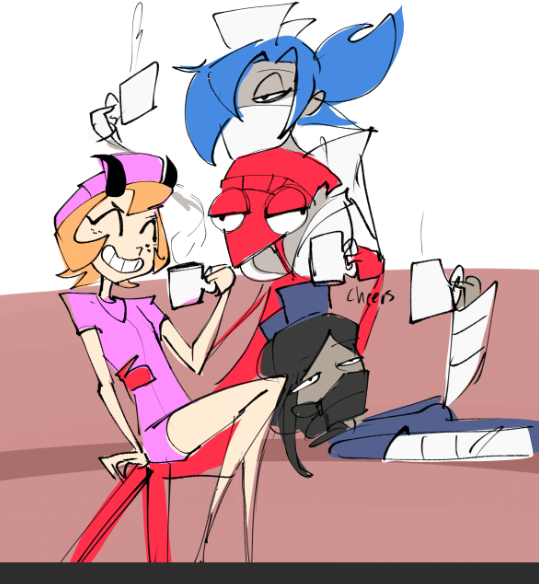 1boy 3girls artist_self-insert bandages coffee_mug couch cup freckles gloves hallow_(skullgirls) hat horns latex latex_gloves mask mouth_mask mug multiple_girls nurse nurse_cap patty_(skullgirls) skullgirls steam surgical surgical_mask valentine_(skullgirls) zdecielo