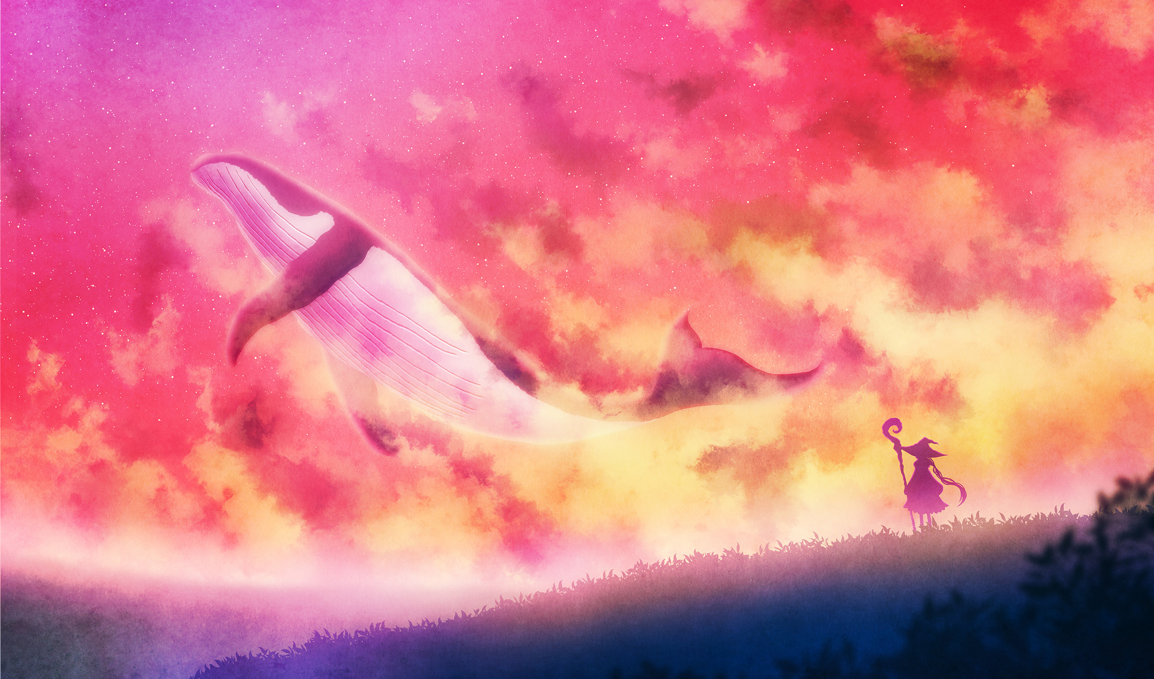 1girl blurry blurry_foreground cloud cloudy_sky dress grass hat highres holding holding_staff horizon long_hair mage_staff original outdoors pink_sky red_sky scenery sky staff star_(sky) starry_sky urara_(1112132) whale wizard wizard_hat yellow_sky