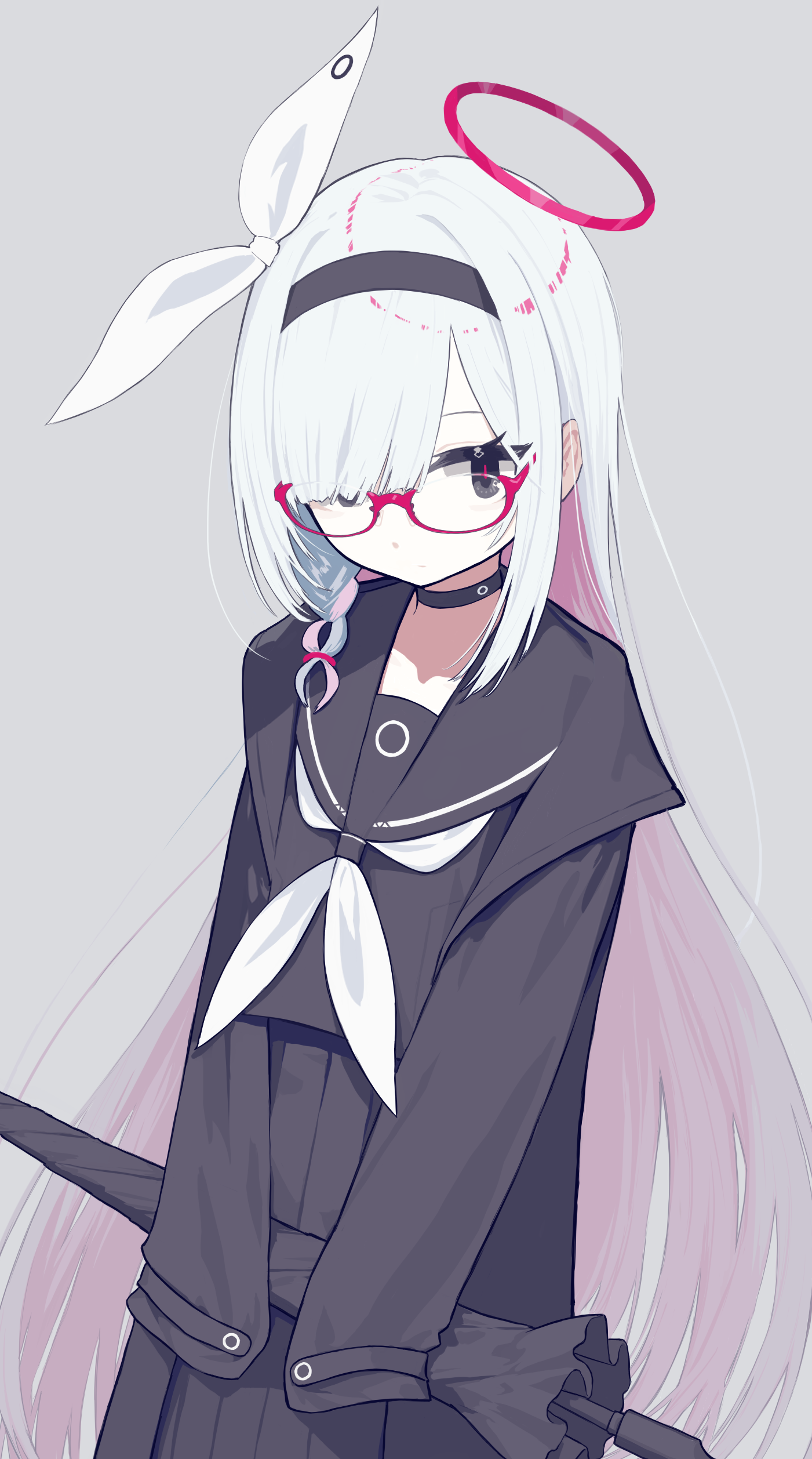 1girl absurdres bespectacled black_choker black_coat black_hairband black_sailor_collar black_shirt black_skirt black_umbrella blue_archive choker coat colored_inner_hair commentary glasses grey_background hair_ribbon hairband halo highres holding holding_umbrella long_hair multicolored_hair neckerchief papaia_(quentingqoo) pink-framed_eyewear pink_hair pink_halo plana_(blue_archive) pleated_skirt ribbon sailor_collar semi-rimless_eyewear shirt simple_background skirt solo umbrella under-rim_eyewear very_long_hair white_neckerchief white_ribbon