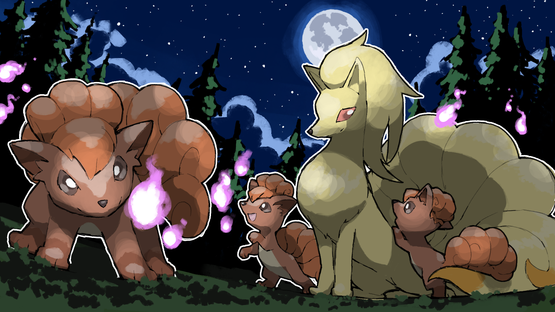 :d animal_focus blacknirrow brown_eyes closed_mouth evolutionary_line extra_tails fire full_moon gen_1_pokemon highres moon night ninetales nintendo no_humans open_mouth outline pokemon pokemon_(creature) pokemon_focus pokemon_move purple_fire red_eyes sky smile star_(sky) tree vulpix white_outline will-o-wisp_(pokemon)