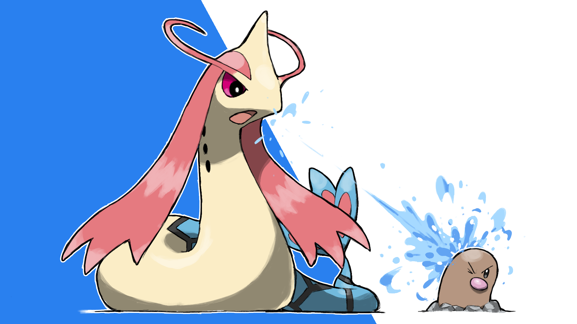 animal_focus blacknirrow colored_sclera commission diglett gen_1_pokemon gen_3_pokemon highres milotic nintendo no_humans one_eye_closed open_mouth pixiv_commission pokemon pokemon_(creature) pokemon_focus pokemon_move red_sclera simple_background two-tone_background type_effectiveness v-shaped_eyebrows water water_gun_(pokemon)