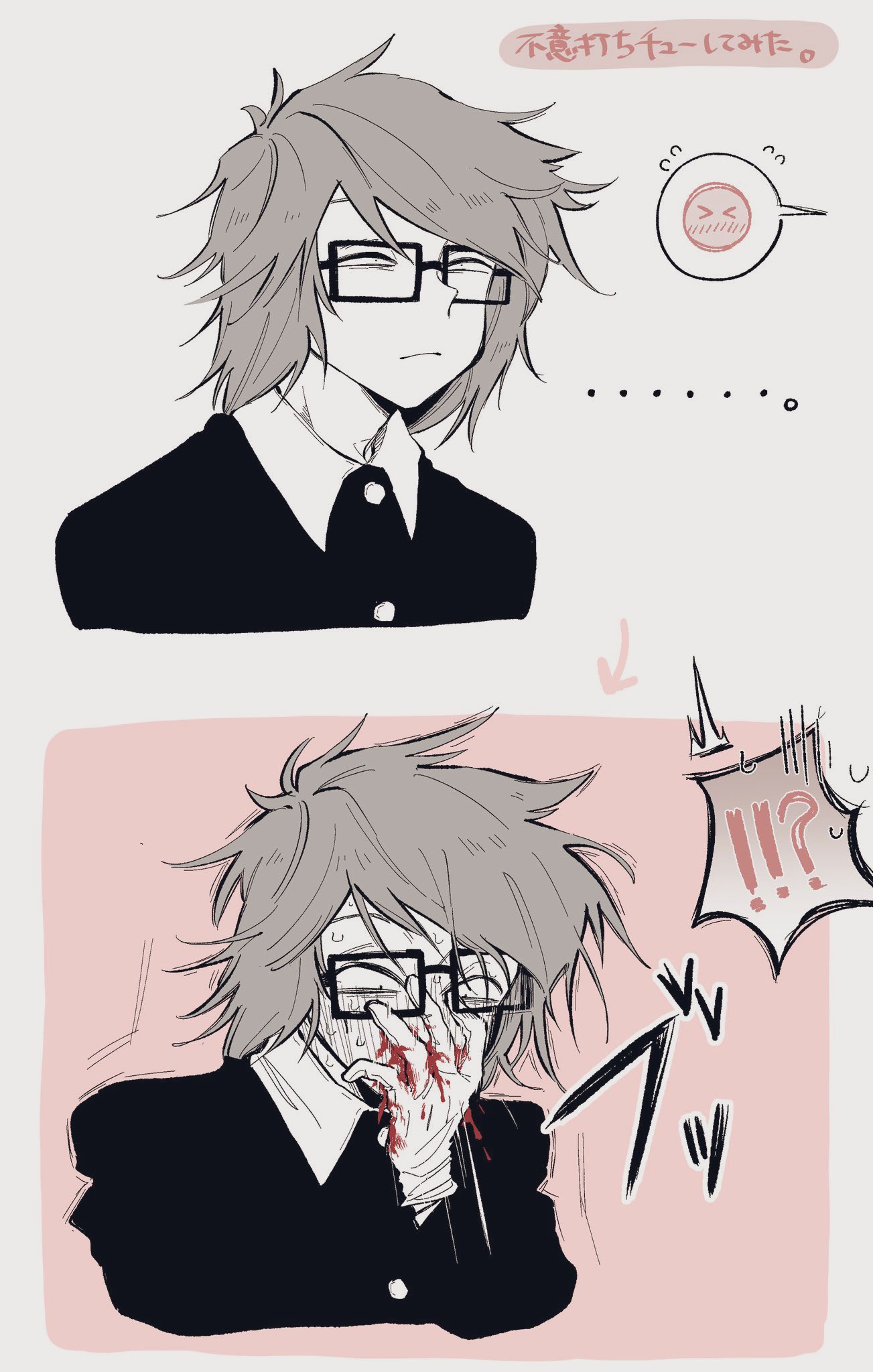 1boy blood covering_own_mouth glasses grey_hair hand_over_own_mouth highres male_focus nek_0323 nosebleed randal's_friends randal_ivory short_hair