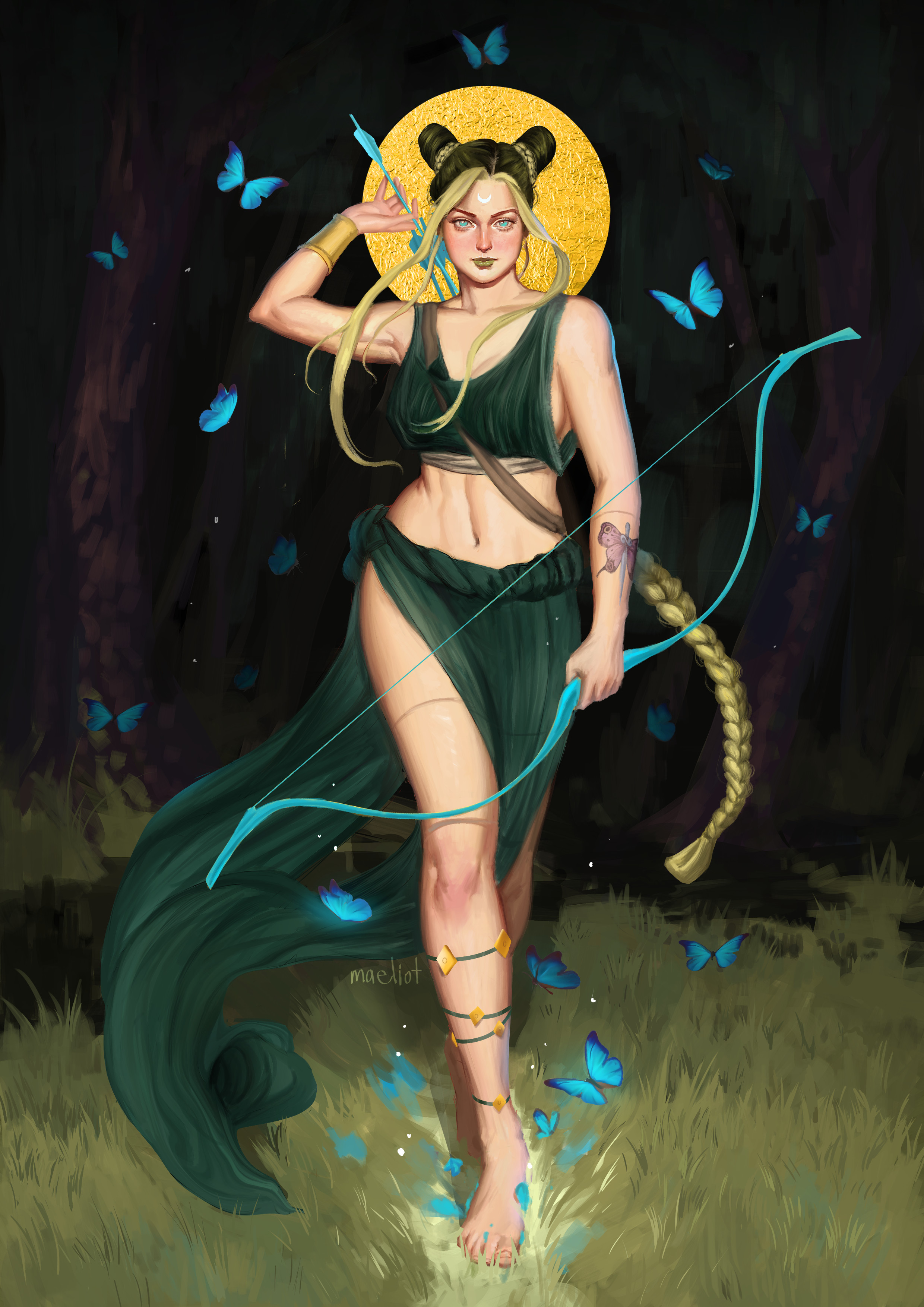 absurdres ancient_greek_clothes archery blue_butterfly bow_(weapon) braid bug bun_with_braided_base butterfly butterfly_tattoo cone_hair_bun crescent crescent_facial_mark double_bun facial_mark grass greco-roman_clothes green_lips hair_bun highres insect jojo_no_kimyou_na_bouken kuujou_jolyne maeliot multicolored_hair stone_ocean tattoo two-tone_hair weapon