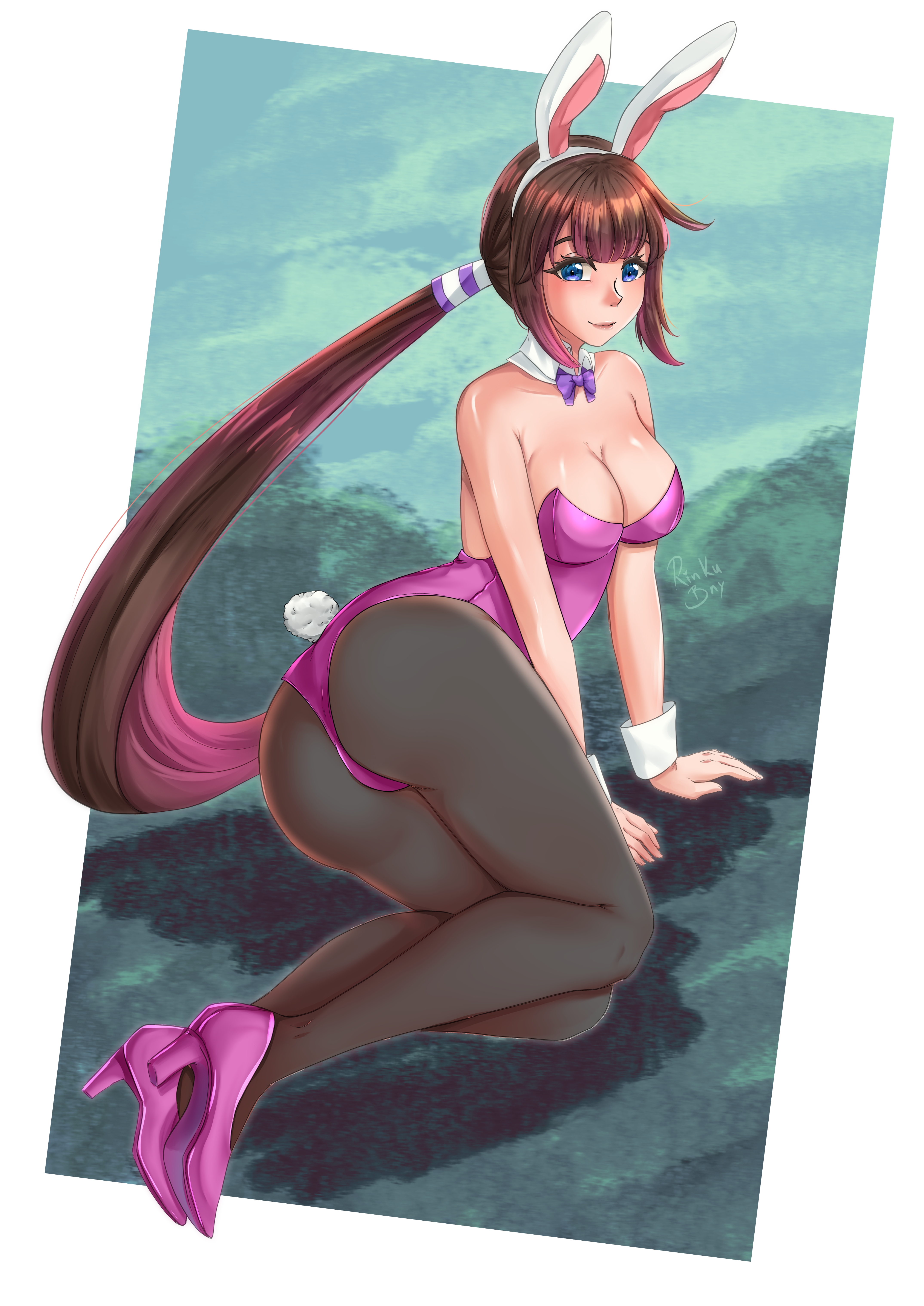 absurdres animal_ears ass blue_eyes blunt_bangs bow bowtie breasts brown_hair cleavage detached_collar fake_animal_ears fake_tail heroine_(pokemon_conquest) high_heels highres large_breasts legs lips long_bangs long_hair looking_at_viewer lying multicolored_hair nintendo on_side pantyhose parted_bangs playboy_bunny pokemon pokemon_conquest ponytail rinku_bny shiny_skin sitting smile solo solo_focus streaked_hair tail thick_thighs thighs very_long_hair wrist_cuffs