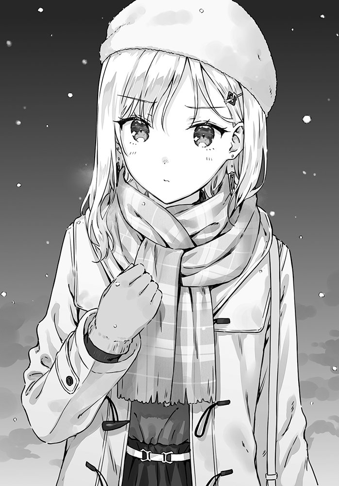 1girl ayase_saki beanie belt closed_mouth coat commentary_request earrings floating_earrings gimai_seikatsu gloves greyscale hair_ornament hairclip hand_up hat hiten_(hitenkei) jewelry long_hair long_sleeves monochrome novel_illustration official_art open_clothes open_coat plaid_clothes plaid_scarf scarf second-party_source shirt_tucked_in snowing solo upper_body winter_clothes