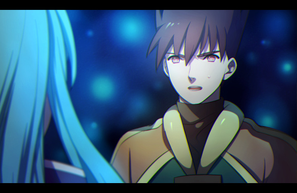 2boys alex_(golden_sun) aqua_hair brown_hair brown_shirt brown_tunic garet_(golden_sun) golden_sun gradient_background long_hair multiple_boys oas open_mouth out_of_frame shirt tunic upper_body