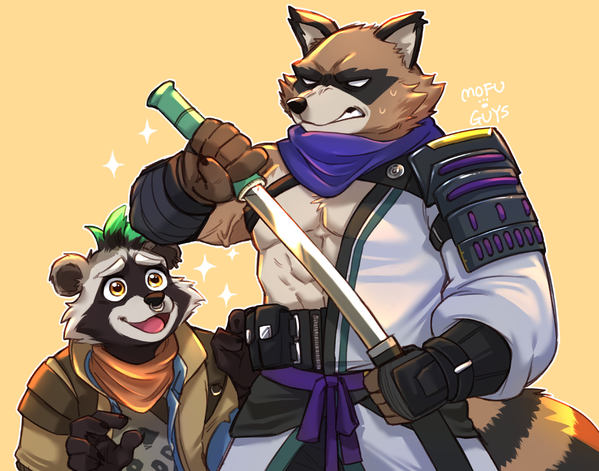 abs animal_ears artist_name claws clenched_teeth commentary english_commentary face_piercing fortnite furry furry_male hajime_(fortnite) highres holding holding_sword holding_weapon katana looking_at_another male_focus mofu_gays mohawk multicolored_hair muscular muscular_male neckerchief nose_piercing nose_ring open_mouth orange_neckerchief pectorals piercing purple_scarf raccoon_boy raccoon_ears raccoon_tail ring_piercing rufus_(fortnite) scarf smile sparkle streaked_hair sweatdrop sword tail teeth weapon yellow_background