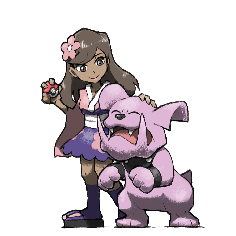 1girl blacknirrow brown_eyes brown_hair closed_eyes closed_mouth dark-skinned_female dark_skin eyelashes fangs flower furisode furisode_girl_(pokemon) furisode_girl_blossom gen_2_pokemon granbull hair_flower hair_ornament hand_on_another's_head holding holding_poke_ball japanese_clothes kimono long_hair nintendo open_mouth pink_flower poke_ball poke_ball_(basic) pokemon pokemon_x_and_y purple_socks simple_background smile socks standing white_background