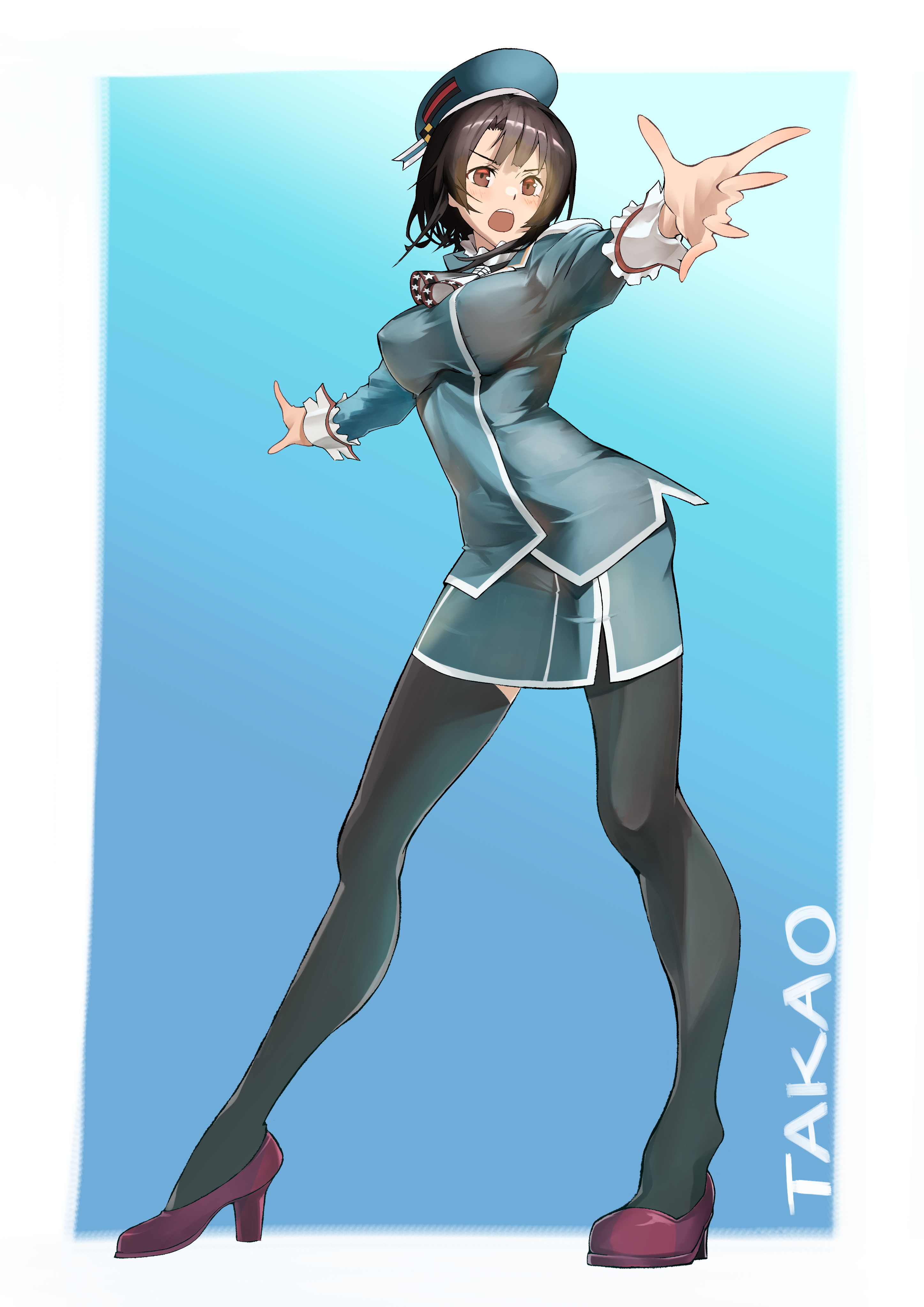 1girl absurdres ascot beret black_gloves black_hair black_thighhighs blue_background blue_hat blush breasts character_name echo-kilo gloves hat highres kantai_collection large_breasts long_hair looking_at_viewer military military_uniform open_mouth red_eyes short_hair skirt solo takao_(kancolle) thighhighs