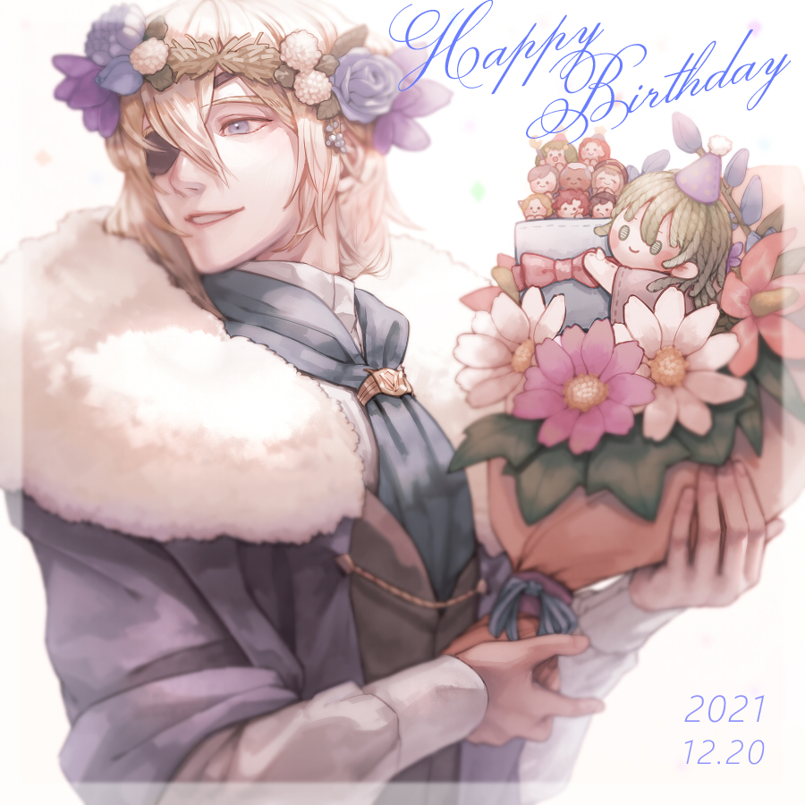 1boy ^_^ annette_fantine_dominic ashe_ubert black_vest blonde_hair blue_flower blue_rose blue_scarf border bouquet bow character_doll closed_eyes commentary d0o00o0b dated dedue_molinaro dimitri_alexandre_blaiddyd dimitri_alexandre_blaiddyd_(timeskip) doll english_commentary english_text felix_hugo_fraldarius female_byleth_(fire_emblem) fire_emblem fire_emblem:_three_houses flayn_(fire_emblem) flower flower_wreath fur_trim green_eyes green_hair hair_behind_ear hair_between_eyes happy_birthday hat holding holding_bouquet ingrid_brandl_galatea layered_clothes leaf long_sleeves looking_to_the_side male_focus mercedes_von_martritz mercedes_von_martritz_(timeskip) nintendo party_hat pink_flower red_bow red_flower red_hair rose scarf shirt smile solo_focus sylvain_jose_gautier teeth upper_body vest white_background white_flower white_fur white_hair white_shirt
