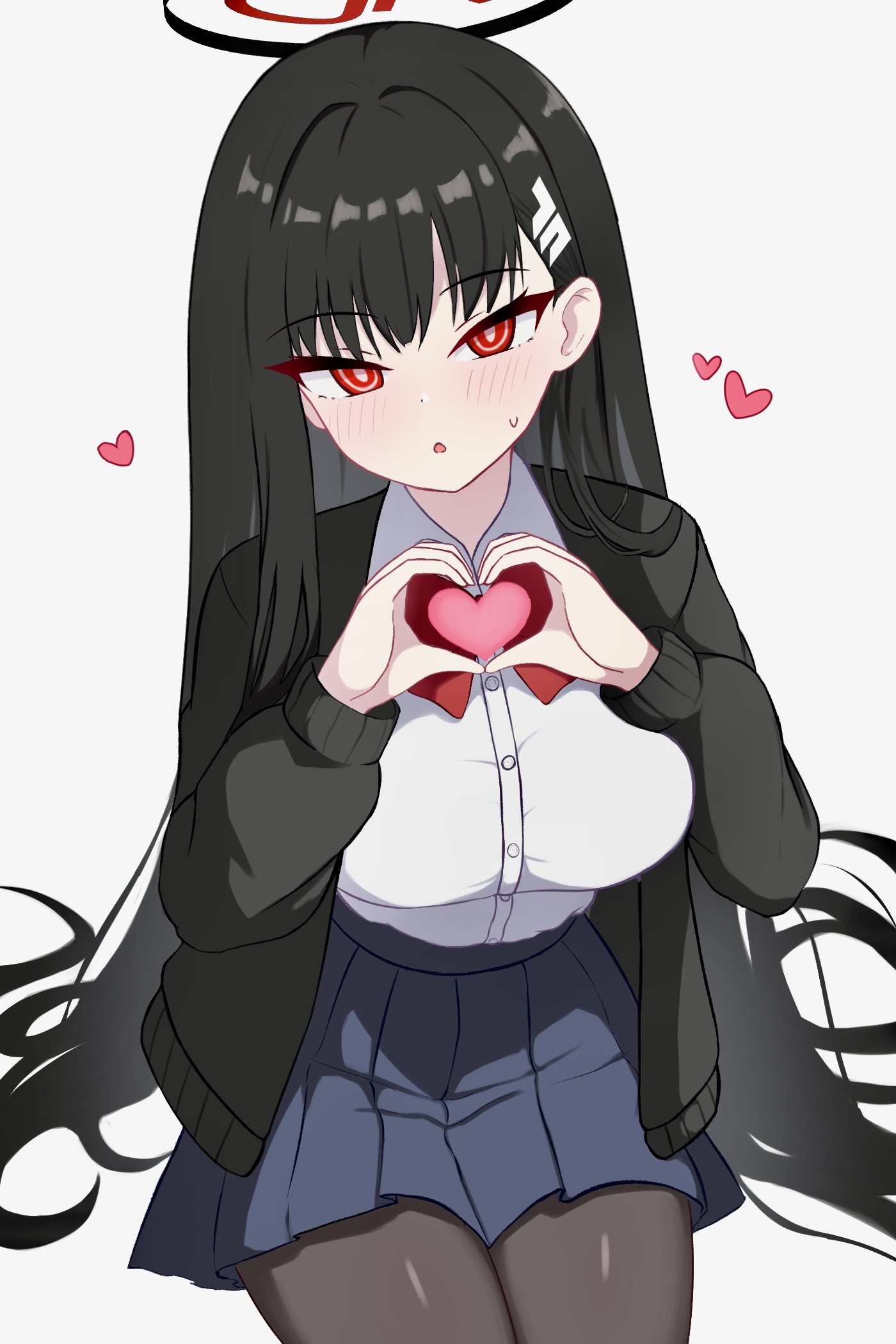 1girl black_hair black_pantyhose blue_archive blush hair_ornament hairclip halo heart heart_hands highres io9 long_hair looking_at_viewer open_mouth pantyhose pleated_skirt red_eyes ringed_eyes rio_(blue_archive) school_uniform simple_background skirt solo sweatdrop very_long_hair white_background
