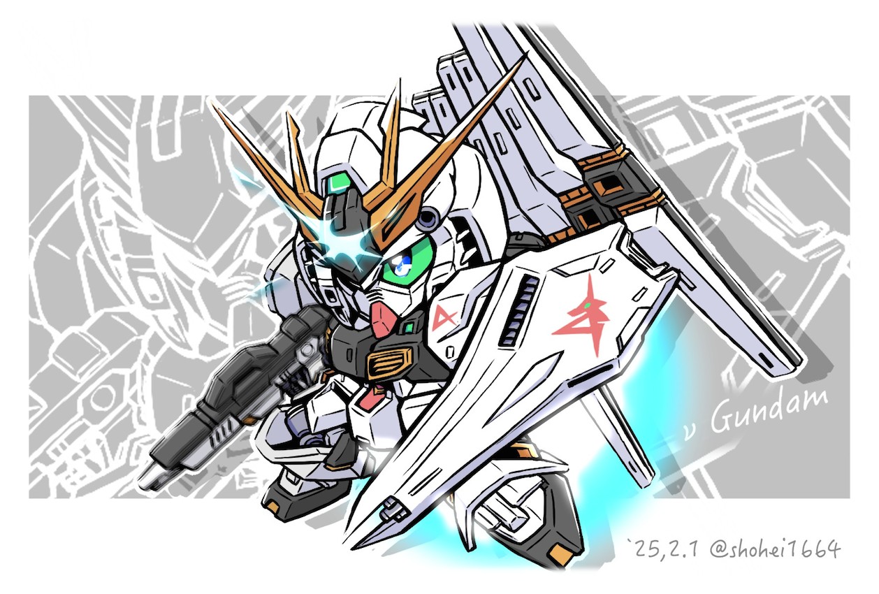 beam_rifle blue_eyes char's_counterattack character_name chibi colored_sclera energy_gun english_text fin_funnels full_body green_sclera gun gundam holding holding_gun holding_weapon looking_at_viewer mecha mobile_suit no_humans nu_gundam robot science_fiction sd_gundam shield shokkaa_(shmz61312) solo twitter_username v-fin weapon